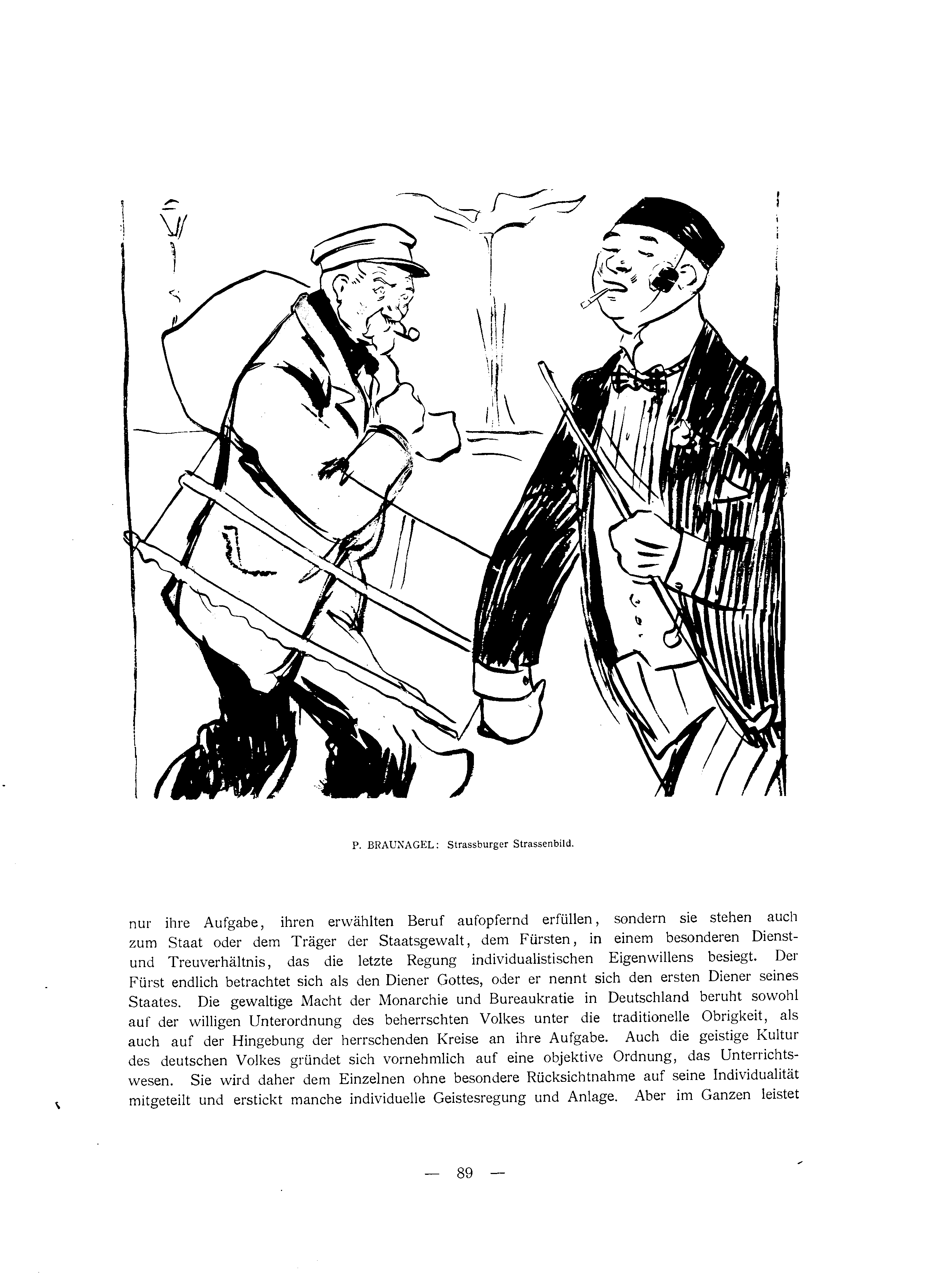 nur ihre Aufgabe, ihren erwählten Beruf aufopfernd erfüllen, sondern sie stehen auch zum Staat oder dem Träger der Staatsgewalt, dem Fürsten, in einem besonderen Dienst und Treuverhältnis, das die letzte Regung individualistischen Eigenwillens besiegt. Der Fürst endlich betrachtet sich als den Diener Gottes, oder er nennt sich den ersten Diener seines Staates. Die gewaltige Macht der Monarchie und Bureaukratie in Deutschland beruht sowohl auf der willigen Unterordnung des beherrschten Volkes unter die traditionelle Obrigkeit, als auch auf der Hingebung der herrschenden Kreise an ihre Aufgabe. Auch die geistige Kultur des deutschen Volkes gründet sich vornehmlich auf eine objektive Ordnung, das Unterrichtswesen. Sie wird daher dem Einzelnen ohne besondere Rücksichtnahme auf seine Individualität mitgeteilt und erstickt manche individuelle Geistesregung und Anlage. Aber im Ganzen leistet
