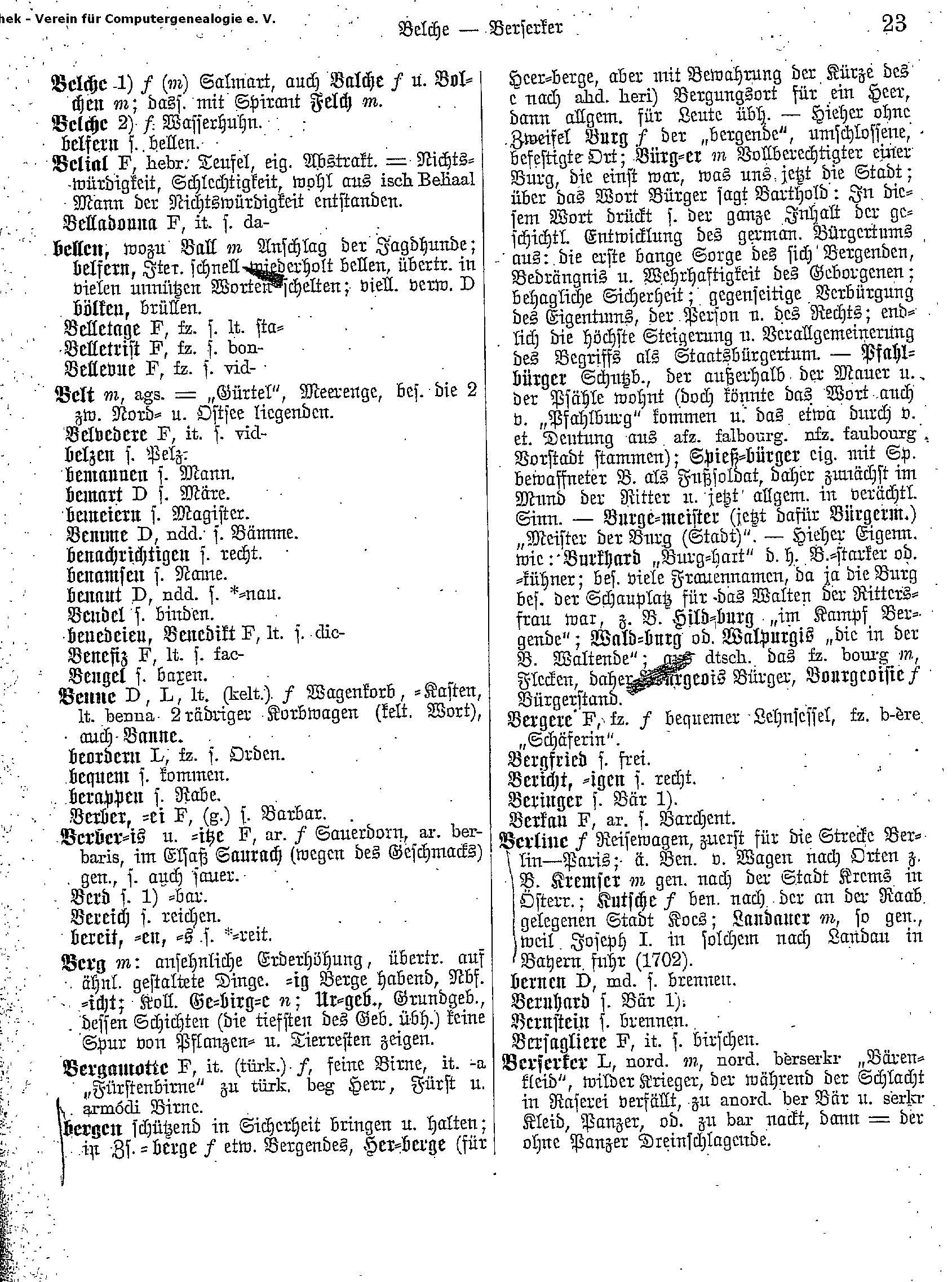 bergen schützend in Sicherheit bringen u. halten; in Zs. -berge f etw. Bergendes, Herberge (für Heerberge, aber mit Bewahrung der Kürze des e nach ahd. heri) Bergungsort für ein Heer, dann allgem. für Leute übh. - hieher ohne Zweifel Burg f der „bergende“, umschlossene, befestigte Ort; Bürger m Vollberechtigter einer Burg, die einst war, was uns jetzt die Stadt; über das Wort Bürger sagt Barthold: In diesem Wort drückt s. der ganze Inhalt der geschlicht. Entwicklung des german. Bürgertums aus: die erste bange Sorge des sich Bergenden, Bedrängnis u. Wehrhaftigkeit des Geborgenen; behagliche Sicherheit; gegenseitige Verbürgung des Eigentums, der Person u. des Rechts; endlich die höchste Steigerung u. Verallgemeinerung des Begriffs als Staatsbürgertum. - Pfahlbürger Schutzb., der außerhalb der Mauer u. der Pfähle wohnt (doch könnte das Wort auch v. „Pfahlburg“ kommen u. das etwa durch v. et. Deutung aus afz. falbourg. nfz. faubourg Vorstadt stammen); Spießbürger eig. mit Sp. bewaffneter Bürger als Fußsoldat, daher zunächst im Mund der Ritter u. jetzt allgem. in verächtl. Sinn. - Burgemeister (jetzt dafür Bürgermeister) „Meister der Burg (Stadt)“. - Hieher Eigenn. wie: Burkhard „Burghart“ d.h. Burg-starker od. -kühner; bes. viele Frauennamen, da ja die Burg bes. der Schauplatz für das Walten der Rittersfrau war, z.B. Hildburg „im Kampf Bergende“; Waldburg od. Walpurgis „die in der Burg Waltende“; aus dtsch. das fz. bourg m, Flecken, daher Bourgeois Bürger, Bourgeoisie f Bürgerstand.