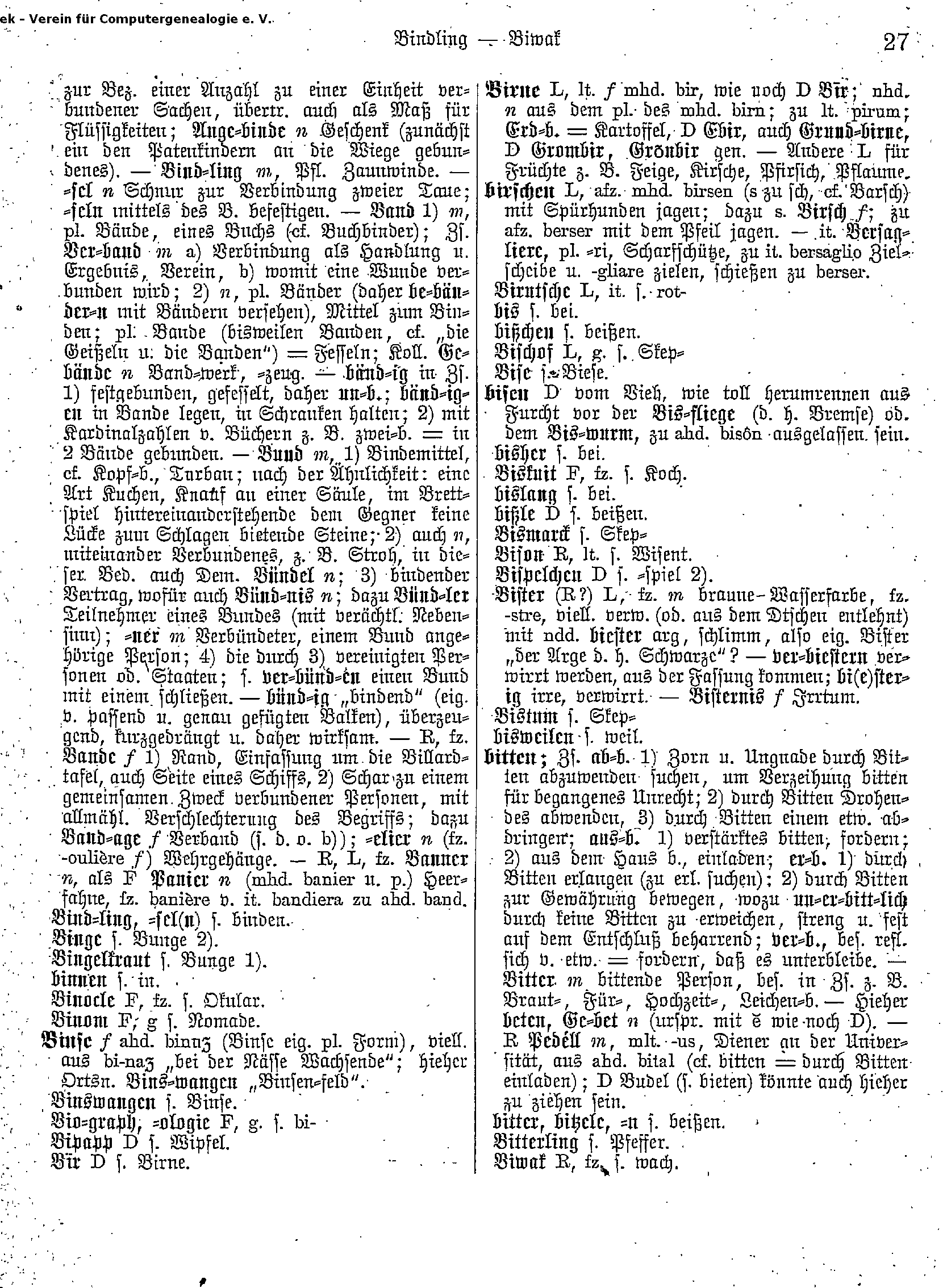 zur Bez. einer Anzahl zu einer Einheit verbundener Sachen, übertr. auch als Maß für Flüssigkeiten; Angebinde n Geschenk (zunächst ein den Patenkinder an die Wiege gebundenes). - Bindling m, Pfl. Zaunwinde. - Bindsel n Schnur zur Verbindung zweier Taue; bindseln mittels des Bindsels befestigen. - Band 1) m, pl. Bände, eines Buchs (cf. Buchbinder); Zs. Verband m a) Verbindung als Handlung u. Ergebnis, Verein, b) womit eine Wunde verbunden wird; 2) n, pl. Bänder (daher bebändern mit Bändern versehen), Mittel zum Binden; pl. Bande (bisweilen Banden, cf. „die Geißeln u. die Banden“) = Fesseln; Koll. Gebände n Bandwerk, Badzeug. - bändig in Zs. 1) festgebunden, gefesselt, daher unbändig; bändigen in Bande legen, in Schranken halten; 2) mit Kardinalzahlen v. Büchern z. B. zweibändig = in 2 Bände gebunden. - Bund m 1) Bindemittel, cf. Kopfbund, Turban; nach der Ähnlichkeit: eine Art Kuchen, Knauf an einer Säule, im Brettspiel hintereinanderstehende dem Gegner keine Lücke zum Schlagen bietende Steine; 2) auch n, miteinander Verbundenesm z. B. Stroh, in dieser Bed. auch Dem. Bündel n; 3) bindender Vertrag, wofür auch Bündnis n; dazu Bündler Teilnehmer eines Bundes (mit verächtl. Nebensinn); Bündnder m Verbündeter, einem Bund angehörige Person; 4) die durch 3) vereinigten Personen od. Staaten; - bündig „bindend“ (eig. v. passend u. genau gefügten Balken), überzeugend, kurzgedrängt u. daher wirksam. - R, fz. Bande f 1) Rand, Einfassung um die Billardtafel, auch Seite eines Schiffs, 2) Schar zu einem gemeinsamen Zweck verbundener Personen, mit allmähl. Verschlechterung des Begriffs; dazu Bandage f Verband (s. d. o. b)); Bandelier n ( fz. bandoulière f) Wehrgehänge. - R, L, fz. Banner n, als F Panier n ( mhd. banier u. panier) Heerfahne, fz. banière v. it. bandiera zu ahd. band.