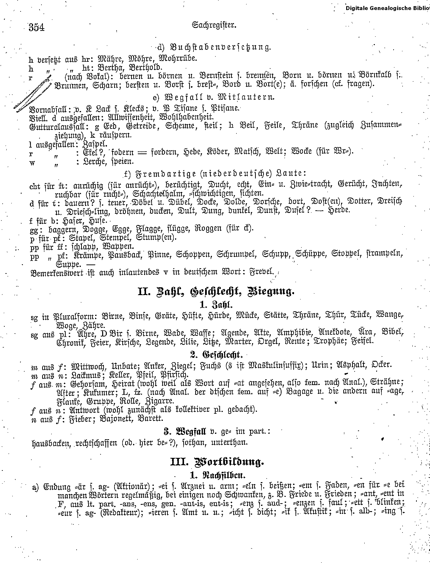 - a) Endung är s. ag- (Aktionär); -ei s. Arznei u. arm; -eln s. beißen; -em s. Faden, -en für -e bei manchen wörtern regelmäßig, bei inigen noch Schwanken, z. B. Friede u. Frieden; -ant, -ent in F, aus lt. part. -ans, -ens, gen. -antis, entis; -enz s. aud-; -enzen s. faul; -ett s. blinken; -eur s. ag- (Redakteur); -ieren s. Ant u. u.; -icht s. dicht; -ik s Akustik; -in s. <tt<alb-; -ing s.