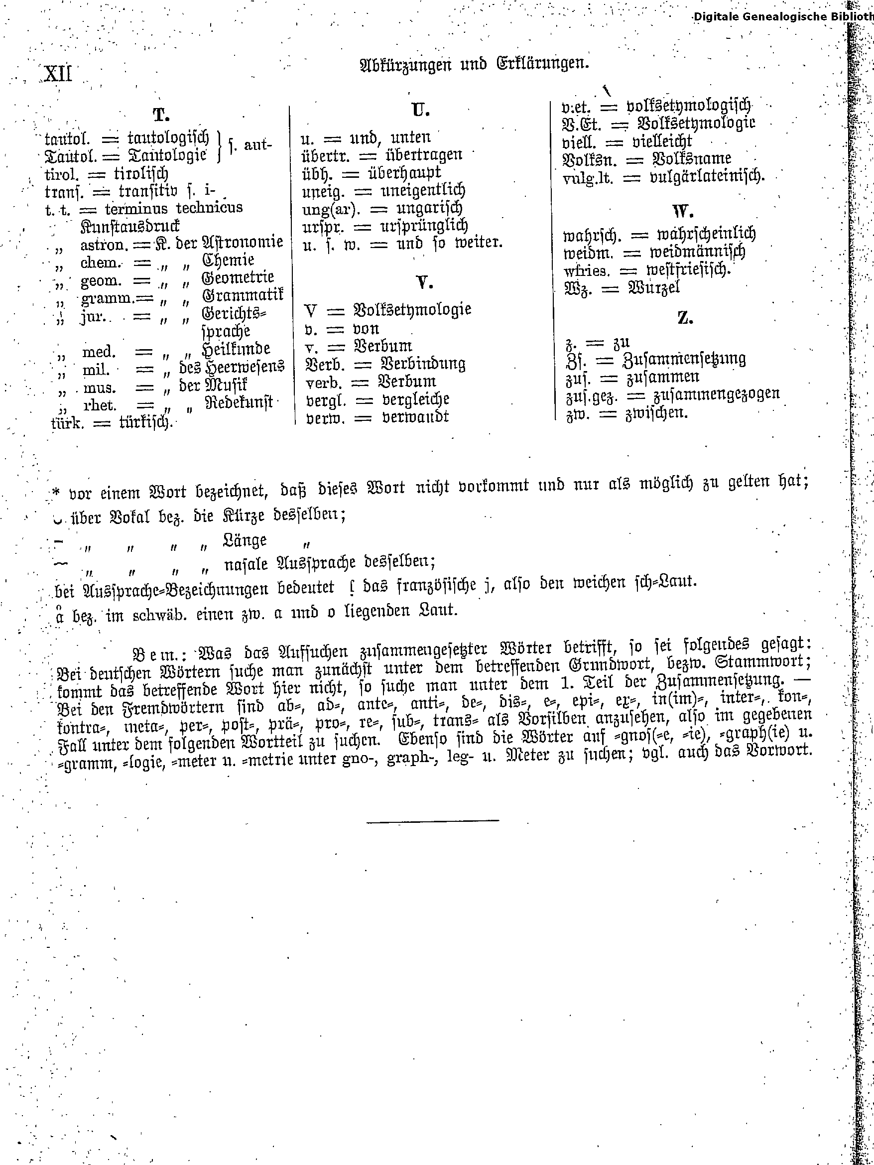 Bei deutschen Wörtern suche man zunächst unter dem betreffenden Grundwort, bezw. Stammwort; kommt das betreffende Wort hier nicht, so suche man unter dem 1. Teil der Zusammensetzung. — Bei den Fremdwörtern sind ab-, ad-, ante-, anti-, de-, dis-, e-, epi-, ex-, in(im)-, inter-, kon-, kontra-, meta-, per-, post-, prä-, pro-, re-, sub-, trans- als Vorsilben anzusehen, also im gegebenen Fall unter dem folgenden Wortteil zu suchen. Ebenso sind die Wörter auf -gnos(-e, -ie), -graph(ie) u. -gramm, -logie, -meter und -metrie unter gno-, graph-, leg- und Meter zu suchen; vgl. auch das Vorwort.