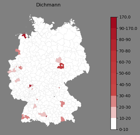 Relative Verteilung des Namens Dichmann (1996)Direkt zur Karte Die Farbskala zeigt die Anzahl von "Dichmann" bezogen auf je 1 Million Einträge. |