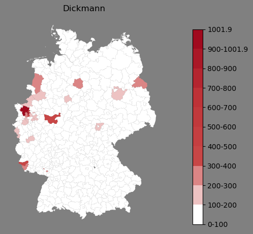 Relative Verteilung des Namens Dickmann (1996)Direkt zur Karte Die Farbskala zeigt die Anzahl von "Dickmann" bezogen auf je 1 Million Einträge. |