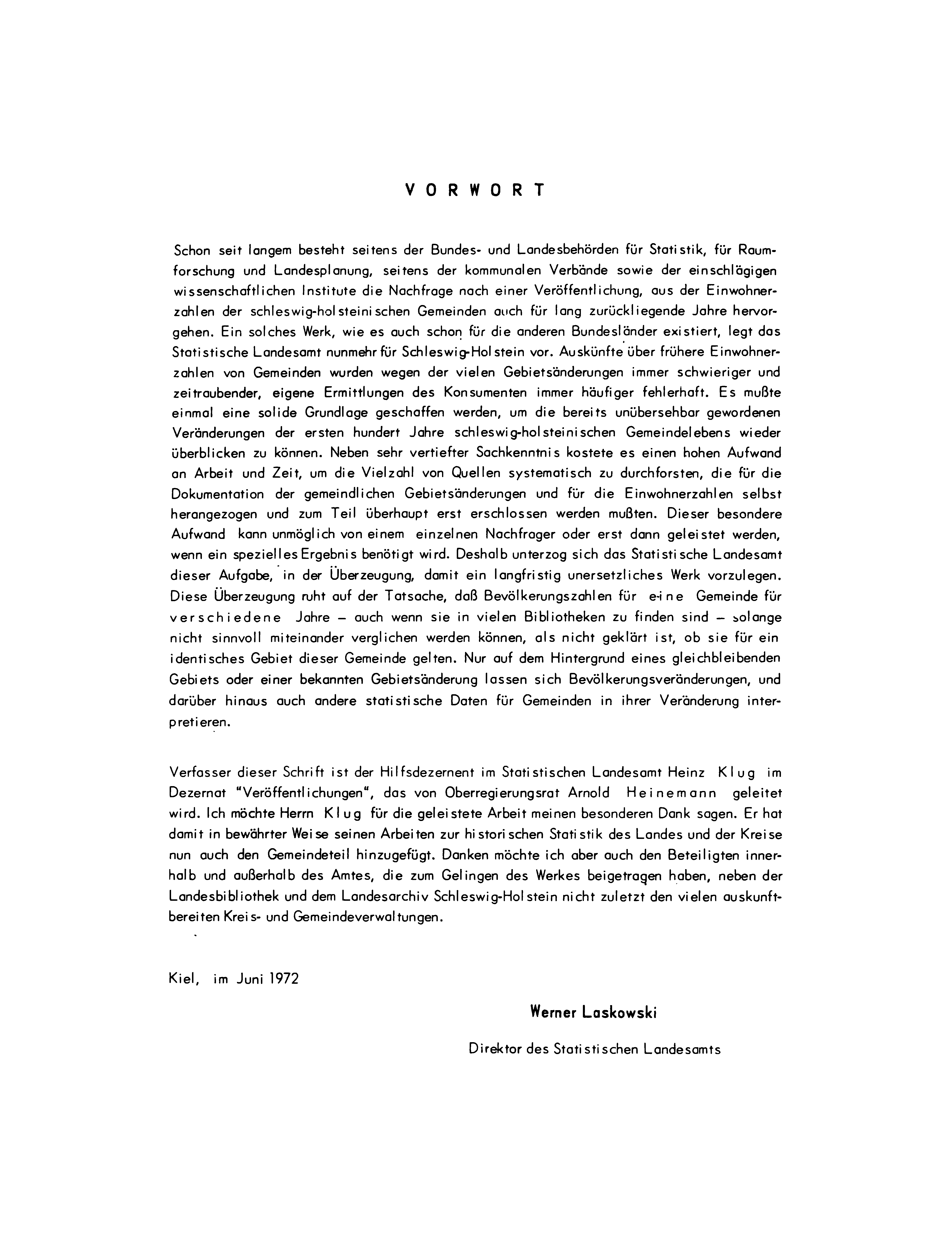 Verfasser dieser Schrift ist der Hilfsdezernent im Statistischen Landesamt Heinz Klug im Dezernat "Veröffentlichungen", das von Oberregierungsrat Arnold Heinemann geleitet wird. Ich möchte Herrn Klug für die geleistete Arbeit meinen besonderen Dank sagen. Er hat damit in bewährter Weise seinen Arbeiten zur historischen Statistik des Landes und der Kreise nun auch den Gemeindeteil hinzugefügt. Danken möchte ich aber auch den Beteiligten innerhalb und außerhalb des Amtes, die zum Gelingen des Werkes beigetragen haben, neben der Landesbibliothek und dem Landesarchiv Schleswig-Holstein nicht zuletzt den vielen auskunftbereiten Kreis- und Gemeindeverwaltungen.