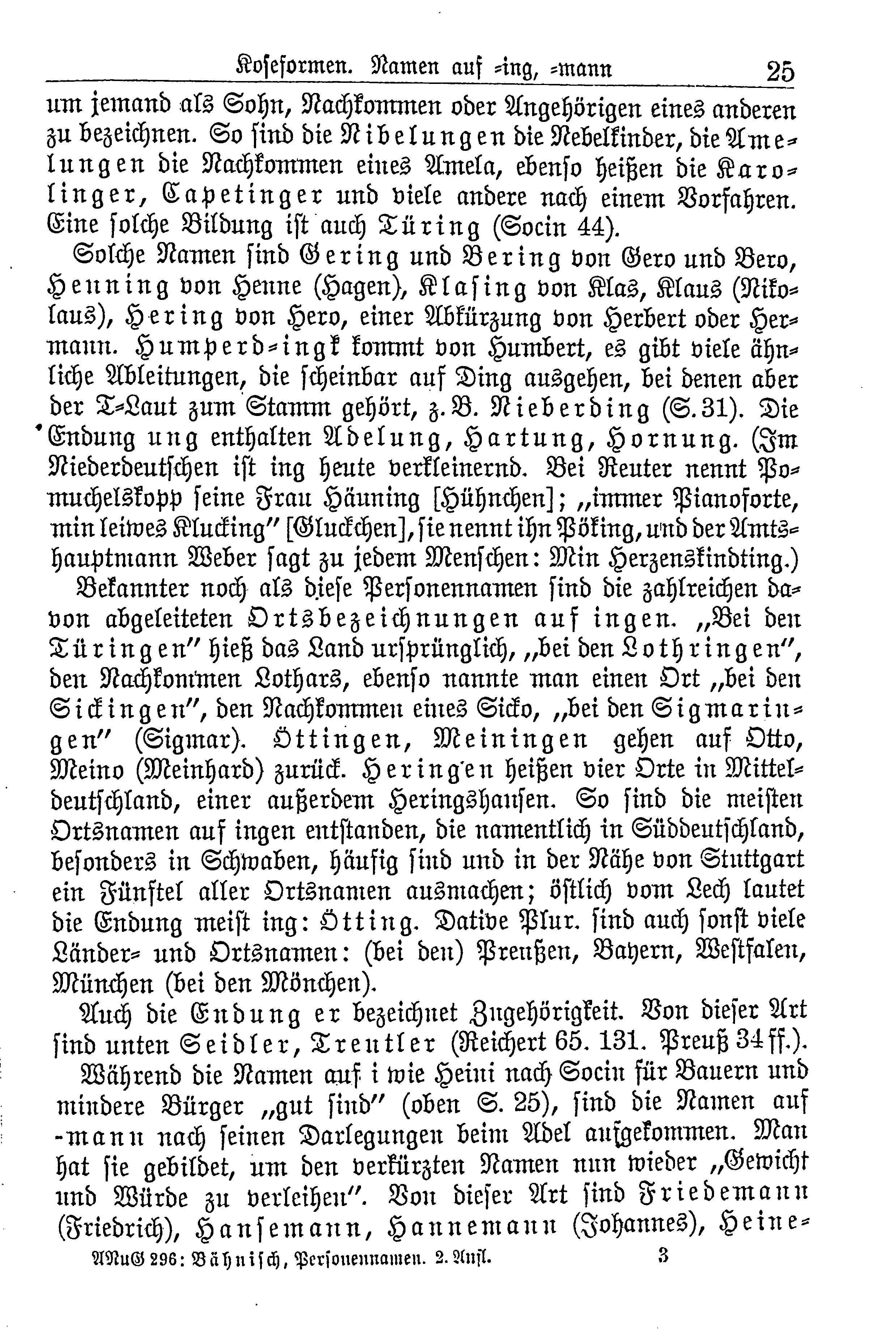 Solche Namen sind Gering und Bering von Gero und Bero, Henning von Henne (Hagen), Klasing von Klas, Klaus (Nikolaus), Hering von Hero, einer Abkürzung von Herbert oder Hermann. Humperd-ingk kommt von Humbert, es gibt viele ähnliche Ableitungen, die scheinbar auf Ding ausgehen, bei denen aber der T-Laut zum Stamm gehört, z.B. Nieberding (S. 31). Die Endung ung enthalten Adelung, Hartung, Hornung. (Im Niederdeutschen ist ing heute verkleinernd. Bei Reuter nennt Pomuchelskopp seine Frau Häuning [Hühnchen]; „immer Pianoforte, min leiwes Klucking“ [Gluckchen], sie nennt ihn Pöking, und der Amtshauptmann Weber sagt zu jedem Menschen: Min Herzenskindting.)