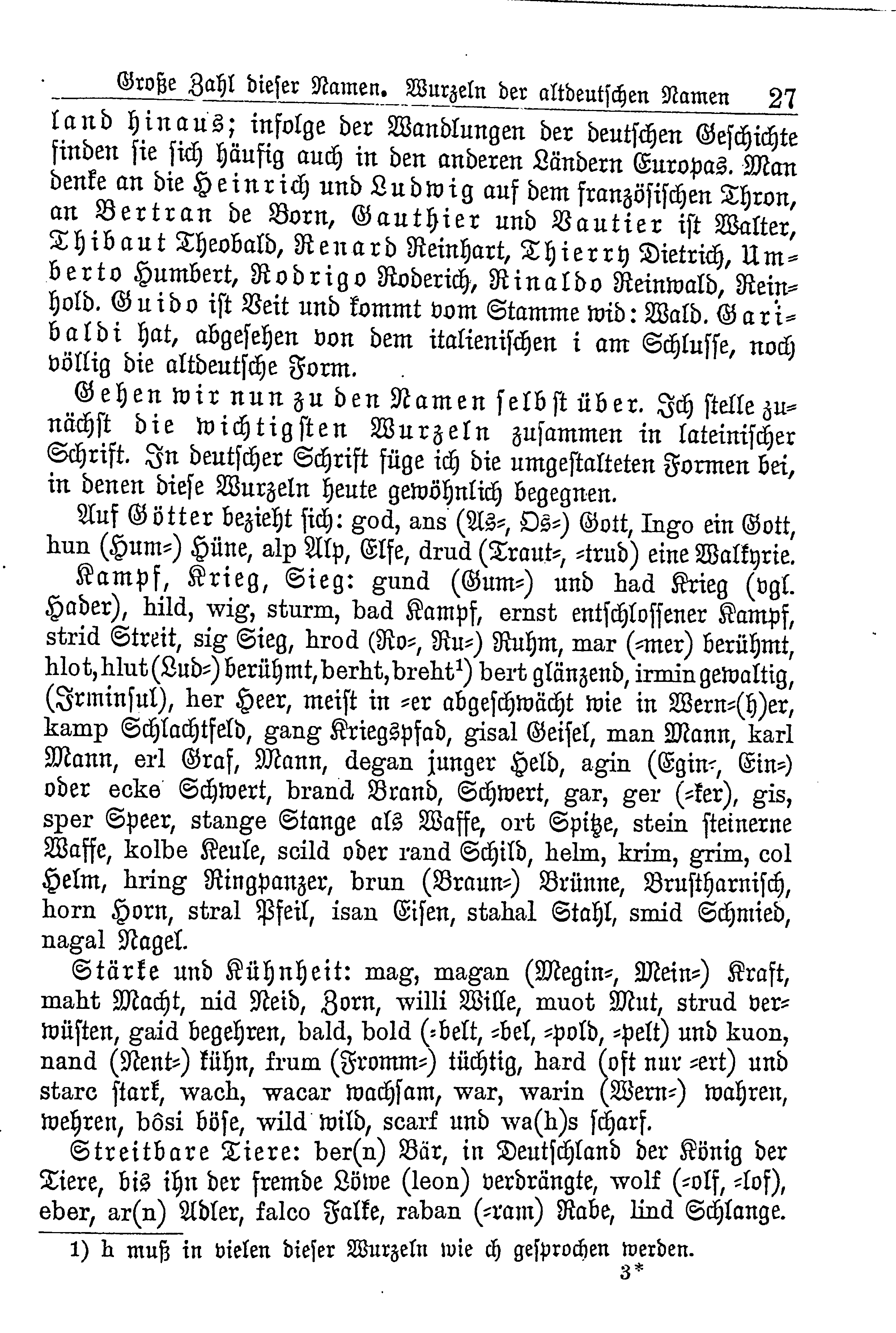 Gehen wir nun zu den Namen selbst über. Ich stelle zunächst die wichtigsten Wurzeln zusammen in lateinischer Schrift. In deutscher Schrift füge ich die umgestalteten Formen bei, in denen diese Wurzeln heute gewöhnlich begegnen.