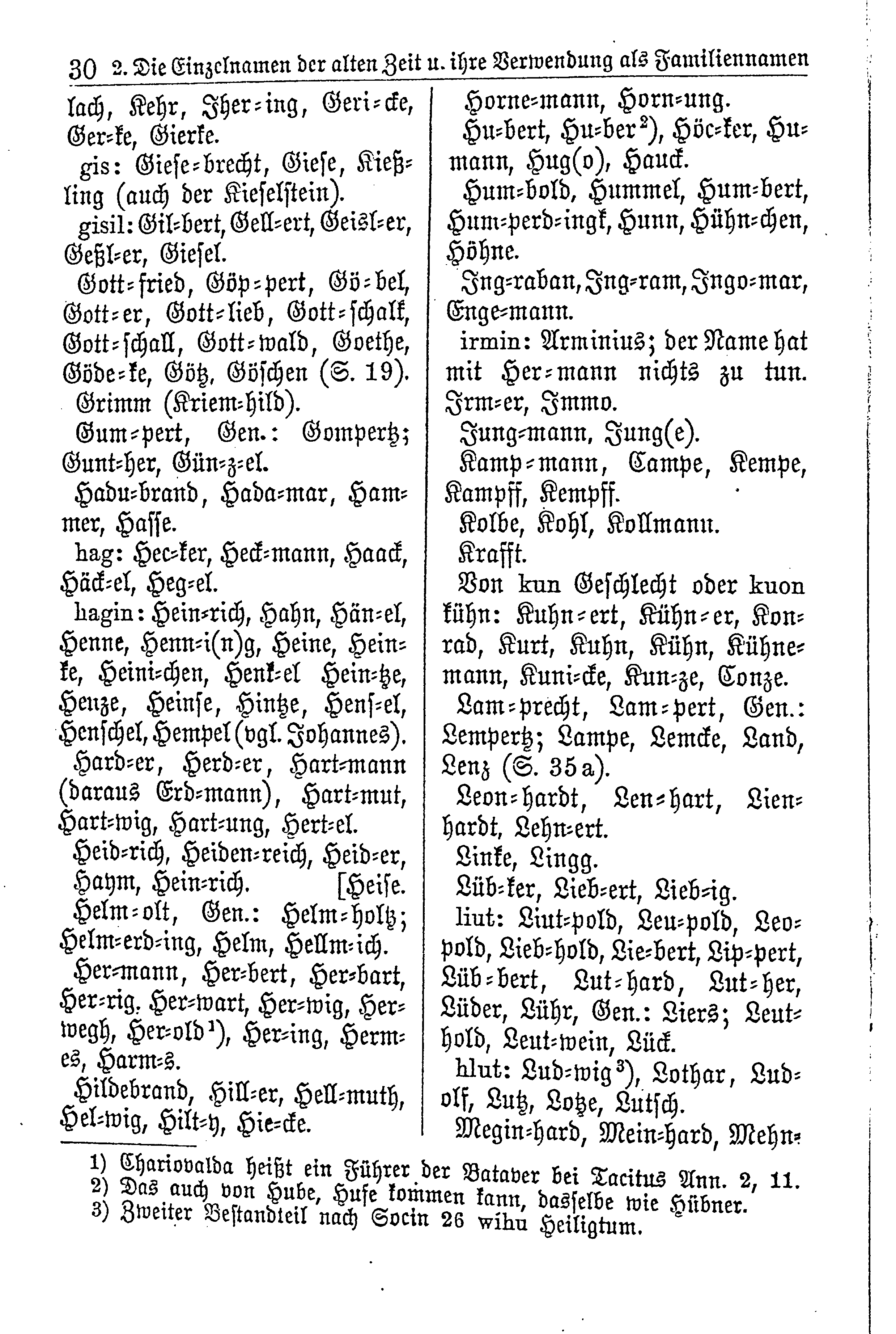 gis: Giese-brecht, Giese, Kieß-ling (auch der Kieselstein). gisil: Gil-bert, Gell-ert, Geisl-er, Geßl-er, Giesel. Gott-fried, Göp-pert, Gö-bel, Gott-er, Gott-lieb, Gott-schalk, Gott-schall, Gott-wald, Goethe, Göde-ke, Götz. Göschen (S. 19). Grimm (Kriem-hild). Gum-pert, Gen.: Gompertz; Gunt-her, Gün-z-el. Hadu-brand, Hada-mar, Hammer, Hasse. hag: Hec-ker, Heck-mann, Haack, Häck-el, Heg-el. hagin Hein-rich, Hahn, Hän-el, Henne, Henn-i(n)g, Heine, Hein-ke, Heini-chen, Henk-el Hein-tze Henze, Heinse, Hintze, Hens-el, Henschel, Hempel (vgl. Johannes). Hard-er, Herd-er, Hart-mann (daraus Erd-mann), Hart-mut, Hart-wig, Hart-ung, Hert-el. Heid-rich, Heiden-reich, Heid-er, Heise. Haym, Hein-rich. Helm-olt, Gen.: Helm-holtz; Helm-erd-ing, Helm, Hellm-ich. Her-mann, Her-bert, Her-bart, Her-rig, Her-wart, Her-wig, Her-wegh, Her-old[1], Her-ing, Hermes, Harm-s. Hildebrand, Hill-er, Hell-muth, Hel-wig, Hilt-y, Hie-cke. |