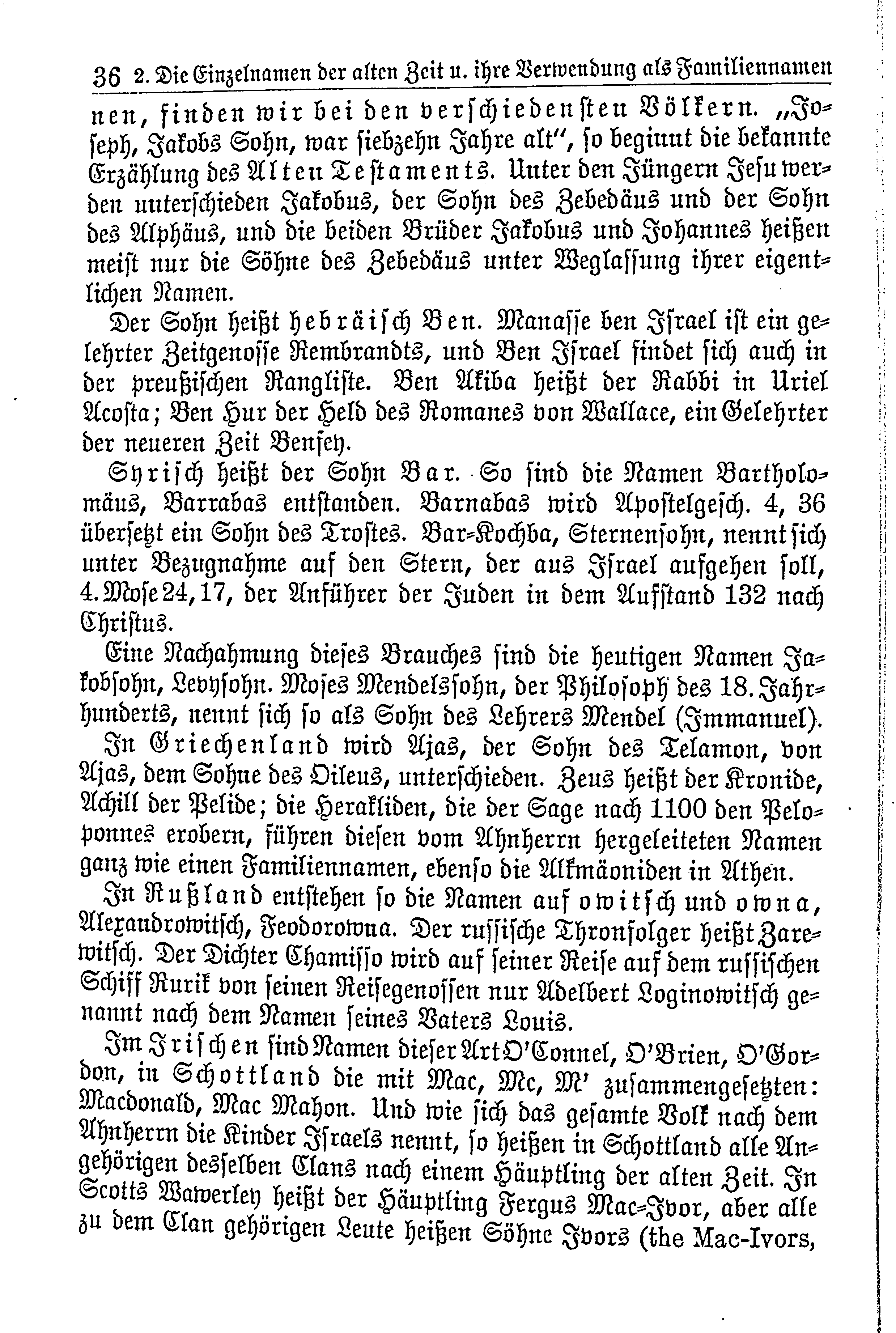 Im Irischen sind Namen dieser Art O'Connel, O'Brien, O'Gordon, in Schottland die mit Mac, Mc, M' zusammengesetzten: Macdonald, Mac Mahon. Und wie sich das gesamte Volk nach dem Ahnherrn die Kinder Israels nennt, so heißen in Schottland alle Angehörigen desselben Clans nach einem Häuptling der alten Zeit. In Scotts Wawerley heißt der Häuptling Fergus Mac-Ivor, aber alle zu dem Clan gehörigen Leute heißen Söhne Ivors (the Mac-Ivors,