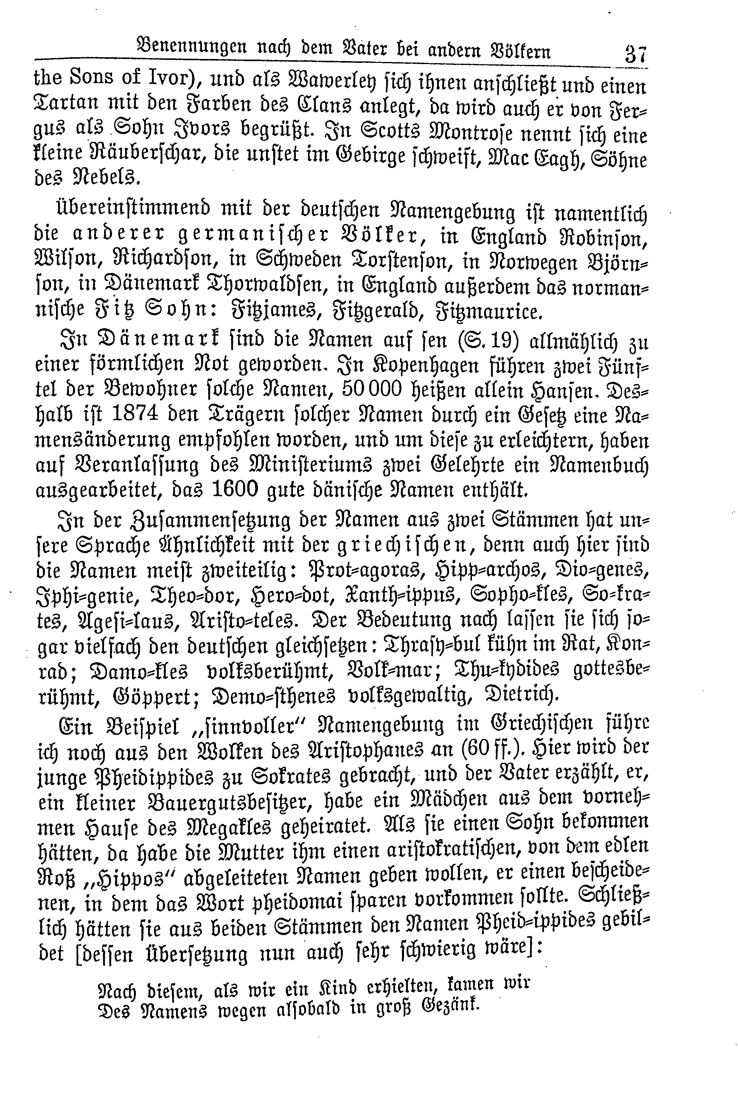 In der Zusammensetzung der Namen aus zwei Stämmen hat unsere Sprache Ähnlichkeit mit der griechischen, denn auch hier sind die Namen meist zweiteilig: Prot-agoras, Hipp-archos, Dio-genes, Iphi-genie, Theo-dor, Hero-dot, Xanth-ippus, Sopho-kles, So-krates, Agesi-laus, Aristo-teles. Der Bedeutung nach lassen sie sich sogar vielfach den deutschen gleichsetzen: Thrasy-bul kühn im Rat, Konrad; Damo-kles volksberühmt, Volk-mar; Thu-kydides gottesberühmt, Göppert; Demo-sthenes volksgewaltig, Dietrich.