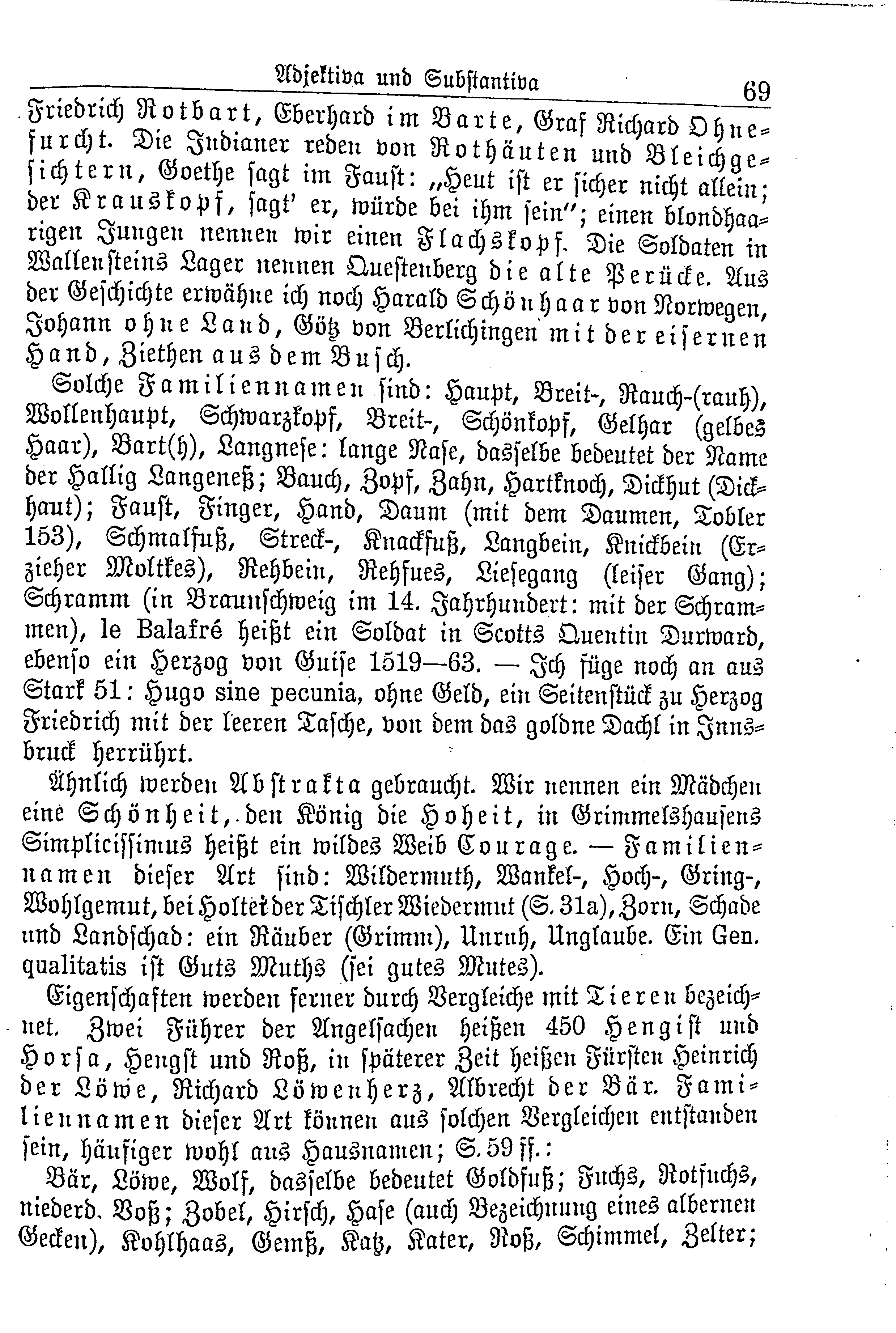 Solche Familiennamen sind: Haupt, Breit-, Rauch-(rauh), Wollenhaupt, Schwarzkopf, Breit-, Schönkopf, Gelhar (gelbes Haar), Bart(h), Langnese: lange Nase, dasselbe bedeutet der Name der Hallig Langeneß; Bauch, Zopf, Zahn, Hartknoch, Dickhut (Dickhaut); Faust, Finger, Hand, Daum (mit dem Daumen, Tobler 153), Schmalfuß, Streck-, Knackfuß, Langbein, Knickbein (Erzieher Moltkes), Rehbein, Rehfues, Liesegang (leiser Gang); Schramm (in Braunschweig im 14. Jahrhundert: mit der Schrammen), le Balafré heißt ein Soldat in Scotts Quentin Durward, ebenso ein Herzog von Guise 1519-63. — Ich füge noch an aus Stark 51: Hugo sine pecunia, ohne Geld, ein Seitenstück zu Herzog Friedrich mit der leeren Tasche, von dem das goldne Dachl in Innsbruck herrührt.