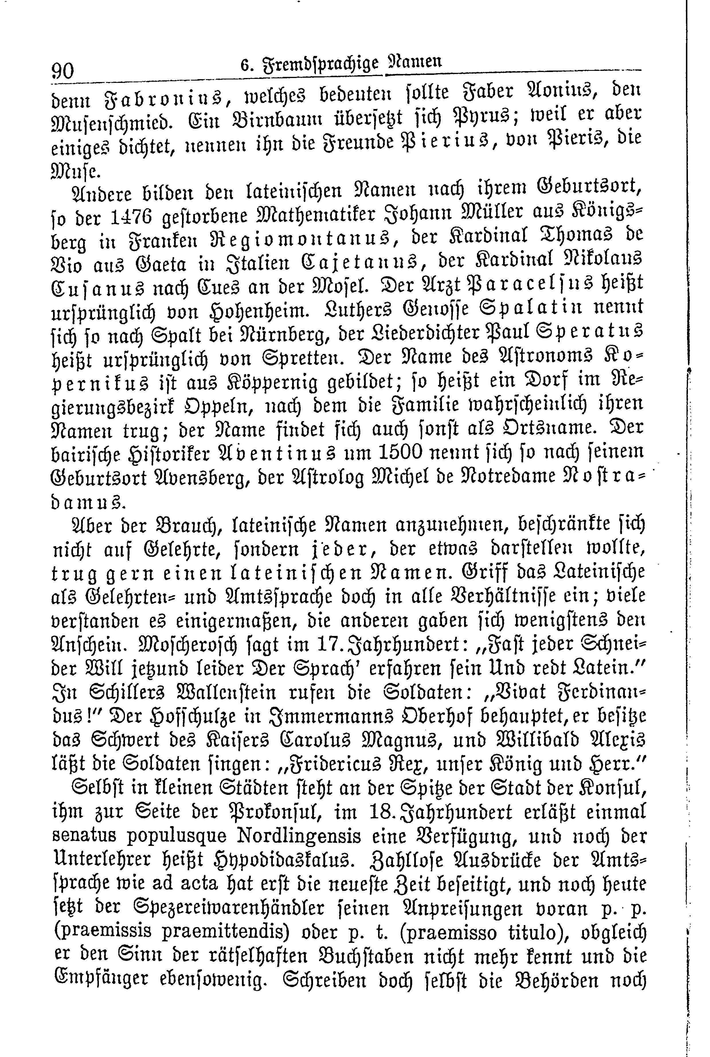 Aber der Brauch, lateinische Namen anzunehmen, beschränkte sich nicht auf Gelehrte, sondern jeder, der etwas darstellen wollte, trug gern einen lateinischen Namen. Griff das Lateinische als Gelehrten- und Amtssprache doch in alle Verhältnisse ein; viele verstanden es einigermaßen, die anderen gaben sich wenigstens den Anschein. Moscherosch sagt im 17. Jahrhundert: „Fast jeder Schneider Will jetzund leider Der Sprach' erfahren sein Und redt Latein.“ In Schillers Wallenstein rufen die Soldaten: „Vivat Ferdinandus!“ Der Hofschulze in Immermanns Oberhof behauptet, er besitze das Schwert des Kaisers Carolus Magnus, und Willibald Alexis läßt die Soldaten singen: „Fridericus Rex, unser König und Herr.“