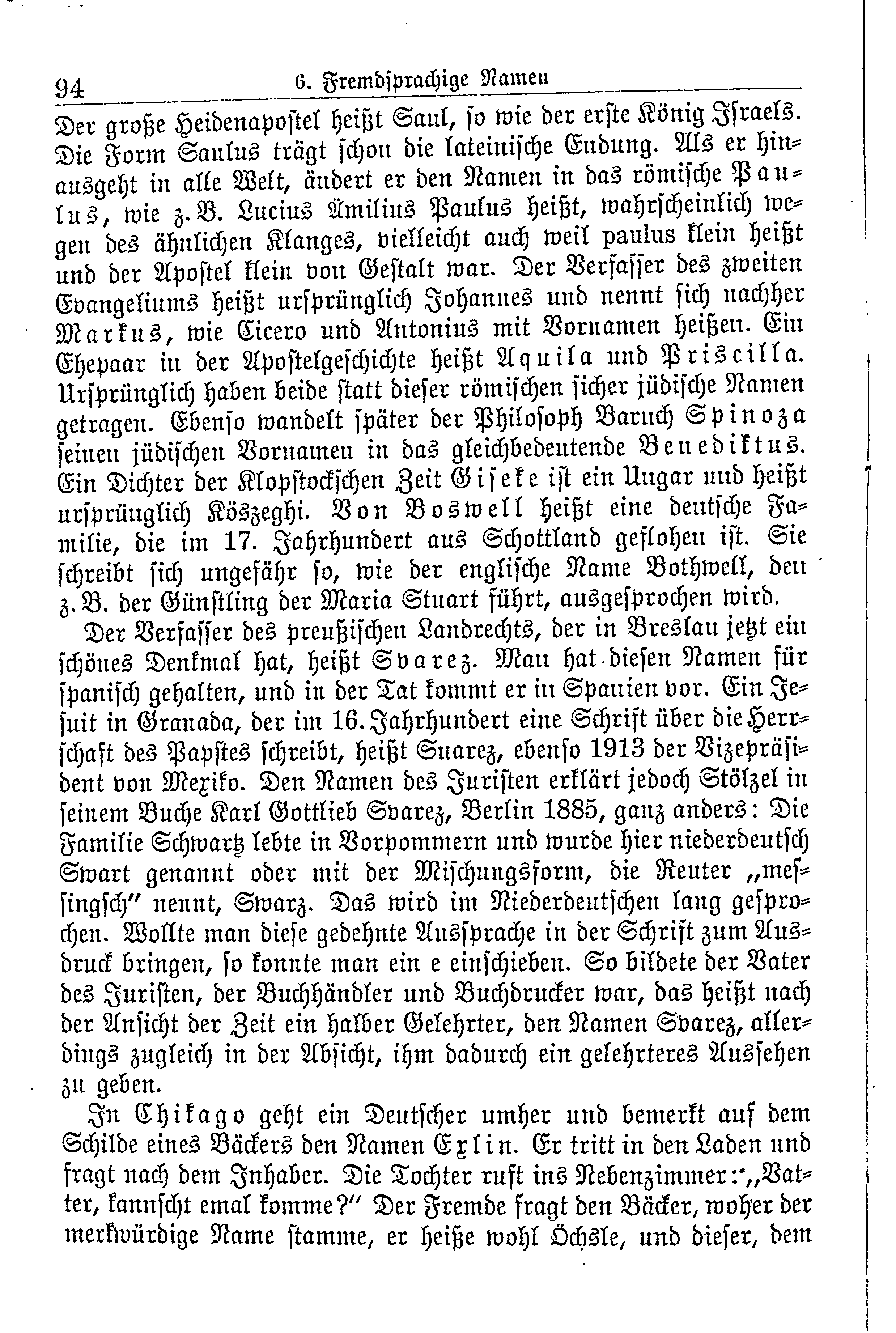Der große Heidenapostel heißt Saul, so wie der erste König Israels. Die Form Saulus trägt schon die lateinische Endung. Als er hinausgeht in alle Welt, ändert er den Namen in das römische Paulus, wie z.B. Lucius Ämilius Paulus heißt, wahrscheinlich wegen des ähnlichen Klanges, vielleicht auch weil paulus klein heißt und der Apostel klein von Gestalt war. Der Verfasser des zweiten Evangeliums heißt ursprünglich Johannes und nennt sich nachher Markus, wie Cicero und Antonius mit Vornamen heißen. Ein Ehepaar in der Apostelgeschichte heißt Aquila und Priscilla. Ursprünglich haben beide statt dieser römischen sicher jüdische Namen getragen. Ebenso wandelt später der Philosoph Baruch Spinoza seinen jüdischen Vornamen in das gleichbedeutende Benediktus. Ein Dichter der Klopstockschen Zeit Giseke ist ein Ungar und heißt ursprünglich Köszeghi. Von Boswell heißt eine deutsche Familie, die im 17. Jahrhundert aus Schottland geflohen ist. Sie schreibt sich ungefähr so, wie der englische Name Bothwell, den z.B. der Günstling der Maria Stuart führt, ausgesprochen wird.