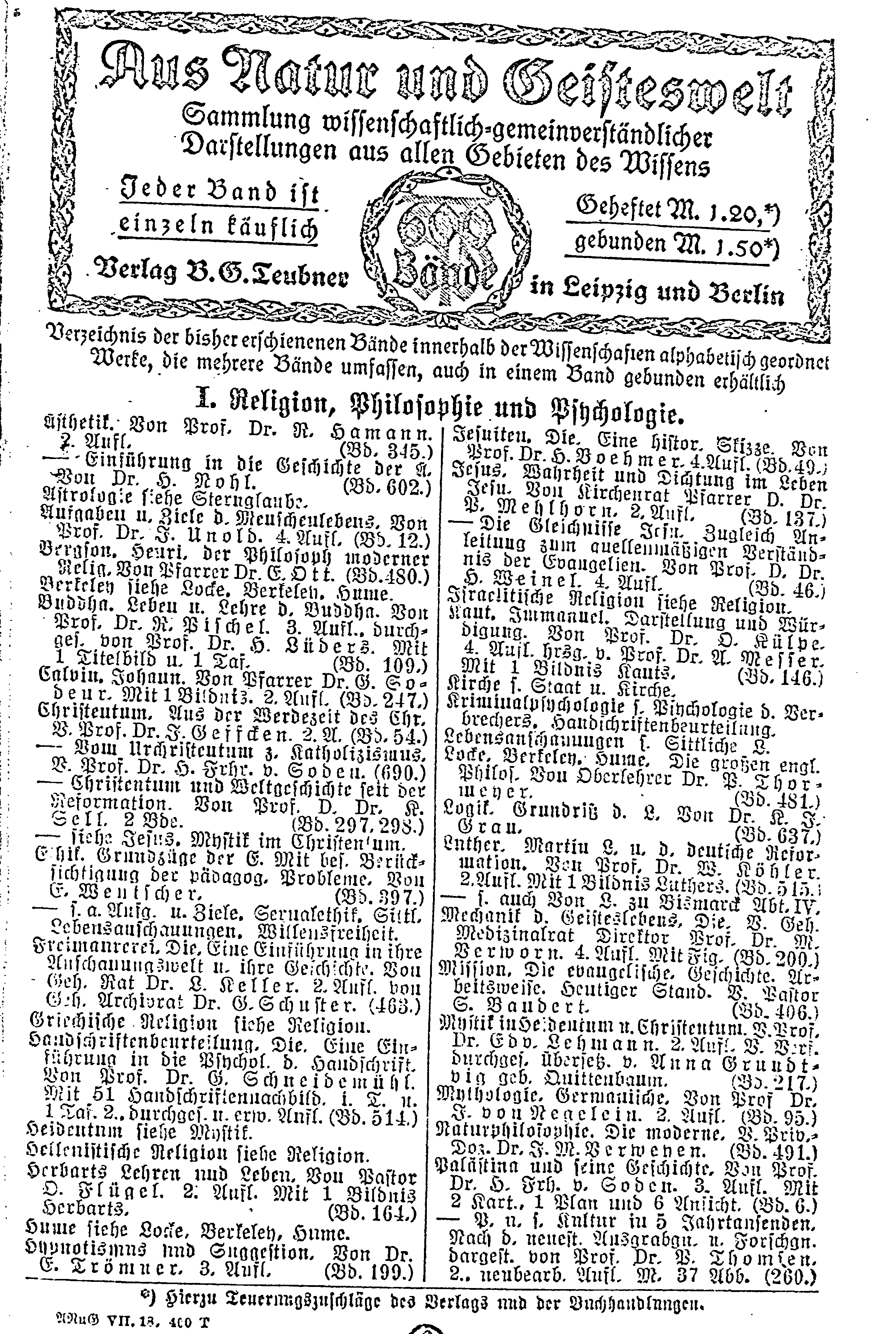 Jesuiten. Die. Eine histor. Skizze. Von Prof. Dr. H. Boehmer. 4.Aufl. (Bd. 49.) Jesus. Wahrheit und Dichtung im Leben Jesu. Von Kirchenrat Pfarrer D. Dr. P. Mehlhorn. 2. Aufl. (Bd. 137) — Die Gleichnisse Jesu. Zugleich Anleitung zum quellenmäßigen Verständnis der Evangelien. Von Prof. D. Dr. H. Weinel. 4. Aufl. (Bd. 46.) Israelitische Religon siehe Religion. Kant. Immauel. Darstellung und Würdigung. Von Prof. Dr. O. Külpe. 4. Aufl. hrsg. v. Prof. Dr. A. Messer. Mit 1 Bildnis Kants. (Bd. 146.) Kirche s. Staat u. Kirche. Kriminalpsychologie s. Psychologie d. Verbrechers. Handschriftenbeurteilung. Lebensanschauungen s. Sittliche L. Locke. Berkeley. Hume. Die großen engl. Philos. Von Oberlehrer Dr. P. Thormeyer. (Bd. 481.) Logik. Grundriß d. L. Von Dr. K. J. Grau. (Bd.637.) Luther. Martin L. u. d. deutsche Reformation. Von Prof. Dr. W. Köhler. 2.Aufl. Mit 1 Bildnis Luthers. (Bd. 515.) — s. auch Von L. zu Bismarck Abt. IV. Mechanik d. Geisteslebens, Die. V. Geh. Medizinalrat, Direktor Prof. Dr. M. Verworn. 4. Aufl. Mit Fig. (Bd. 200.) Mission, Die evangelische. Geschichte. Arbeitsweise. Heutiger Stand. V. Pastor S. Baudert. (Bd. 406.) Mystik in Heidentum u. Christentum. V. Prof. Dr. Edv. Lehmann. 2. Aufl. V. Verf. durchgef. Übersetz. v. Anna Grundtvig geb. Quittenbaum. (Bd. 217.) Mythologie. Germanische. Von Prof. Dr. F. von Negelein. 2. Aufl. (Bd. 95.) Naturphilosophie. Die moderne. V. Priv.-Doz. Dr. J. M. Verweyen. (Bd. 491.) Palästina und seine Geschichte, Von Prof. Dr. H. Frh. v. Soden. 3. Aufl. Mit 2 Kart. 1 Plan und 6 Ansicht. (Bd. 6.) — P. n. s. Kultur in 5 Jahrtausenden. Nach d. neuest. Ausgrabgn. u. Forschgn. dargest. von Prof. Dr. P. Thomsen. 2. neubearb. Aufl. M. 37 Abb. (260.) |