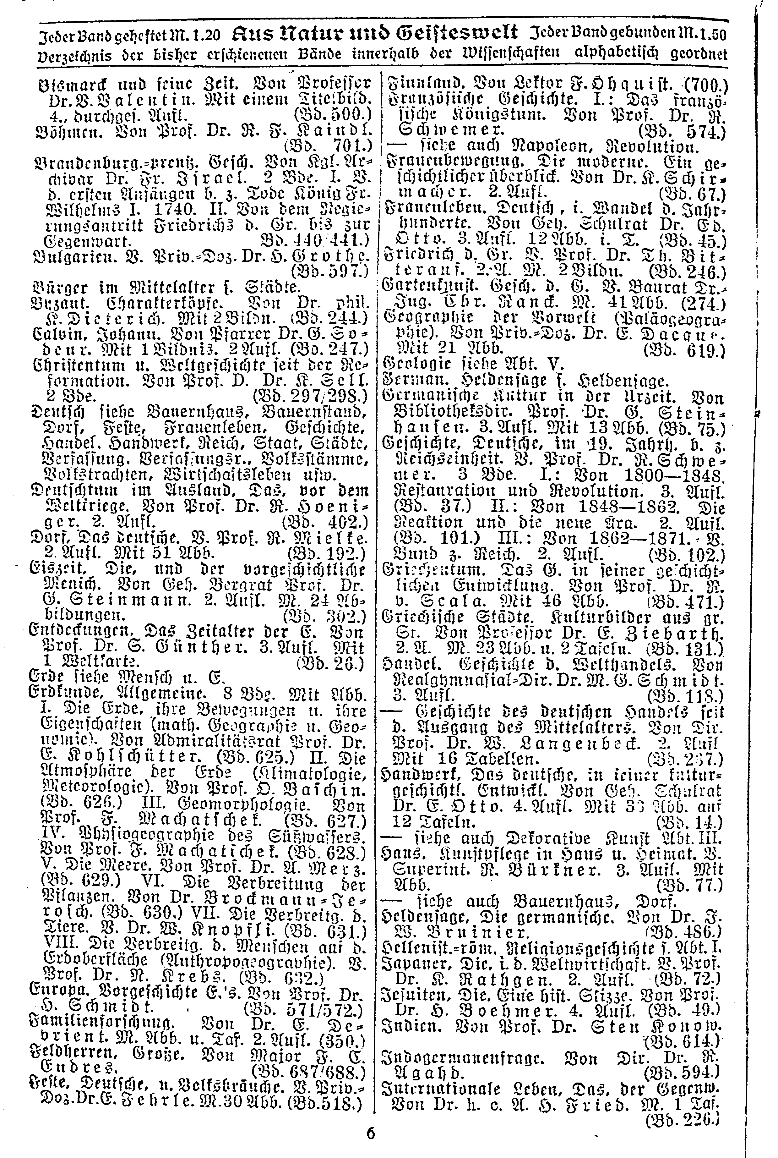 Bismarck und seine Zeit. Von Professor Dr. B. Valentin. Mit einem Titelbild. 4., durchges. Aufl. (Bd. 500.) Böhmen. Von Prof. Dr. R. F. Kaindl. (Bd. 701.) Brandenburg.-preuß;. Gesch. Von Kgl. Archivar Dr. Fr. Israel. 2 Bde. I. V. d. ersten Anfängen b. z. Tode König Fr. Wilhelms I. 1740. II. Von dem Regierungsantritt Friedrichs d. Gr. bis zur Gegenwart. (Bd. 440. 441.) Bulgarien. V. Priv.-Doz. Dr. H. Grotte. (Bd. 597.) Bürger im Mittelalter s. Städte. Byzant. Charakterköpfe. Von Dr. phil. K. Dieterich. Mit 2 Bildn. (Bd. 244.) Calvin. Johann. Von Pfarrer Dr. G. Sodeur. Mit 1 Bildnis. 2 Aufl. (Bd. 247.) Christentum u. Weltgeschichte seit der Reformation. Von Prof. D. Dr. K. Sell. 2 Bde. (Bd. 297/298.) Deutsch siehe Bauernhaus, Bauernstand, Dorf, Feste, Frauenleben, Geschichte, Handel, Handwerk, Reich, Staat, Städte, Verfassung, Verfassungsr., Volkstämme, Volkstrachten, Wirtschaftsleben usw. Deutschtum im Ausland. Das. vor dem Weltkriege. Von Prof. Dr. R. Hoeniger. 2. Aufl. (Bd. 402.) Dorf, Das deutsche. V. Prof. R. Mielke. 2 Aufl. Mit 51 Abb. (Bd. 192.) Eiszeit. Die. und der vorgeschichtliche Mensch. Von Geh. Bergrat Prof. Dr. G. {{Sperrschrift|Steinmann. 2. Aufl. M. 24 Abbildungen. (Bd. 302.) Entdeckungen. Das Zeitalter der E. Von Prof. Dr. S. Günther. 3. Aufl. Mit 1 Weltkarte. (Bd. 26) Erde siehe Mensch u. E. Erdkunde, Allgemeine. 8 Bde. Mit Abb. I. Die Erde, ihre Bewegungen u. ihre Eigenschaften (math. Geographie u. Geonomie). Von Admiralitätsrat Prof. Dr. E. Kohlschütter. (Bd. 625.) II. Die Atmosphäre der Erde (Klimatologie, Meteorologie). Von Prof. O. Vaschin. (Bd. 626.) III. Geomorphologie. Von Prof. F. Machatschek. (Bd. 627.) IV. Physiogeographie des Süßwassers. Von Prof. F. Machatschek. (Bd. 628.) V. Die Meere. Von Prof. Dr. A. Merz. (Bd. 629.) VI. Die Verbreitung der Pflanzen. Von Dr. Brockmann-Jerosch. (Bd. 630.) VII. Die Verbreitg. d. Tiere. V. Dr. W. Knopfli. (Bd. 631) VIII. Die Verbreitg. d. Menschen auf d. Erdoberfläche (Anthropogeographie). V. Prof. Dr. N. Krebs. (Bd. 632.) Europa. Vorgeschichte E.’s. Vnn Prof. Dr. H. Schmidt. (Bd. 571/572.) Familienforschung. Von Dr. E. Debrient. M. Abb. u. Taf. 2. Aufl. (350.) Feldherren, Große. Von Maior F. V. Endres. (Bd 687/688) Feste, Deutsche. u. Volksbräuche. V. Priv.-Doz. Dr. E. Fehrle. M. 30 Abb. (Bd.518.) |