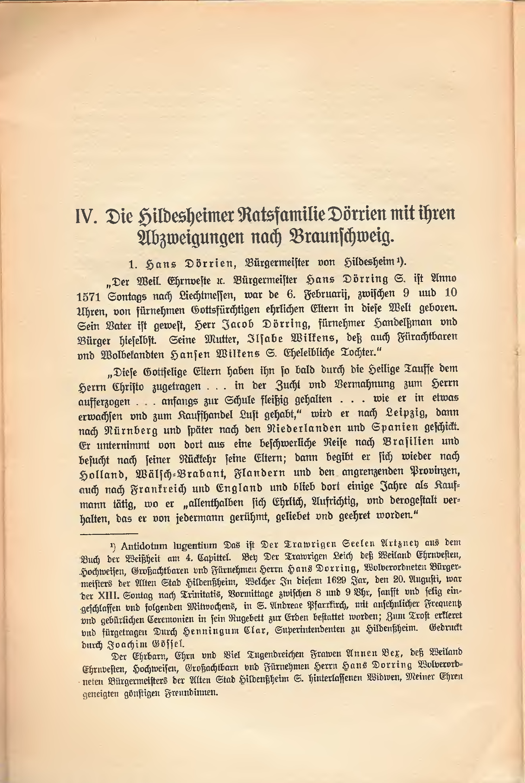 IV. Die Hildesheimer Ratsfamilie Dörrien mit ihren Abzweigungen nach Braunschweig.