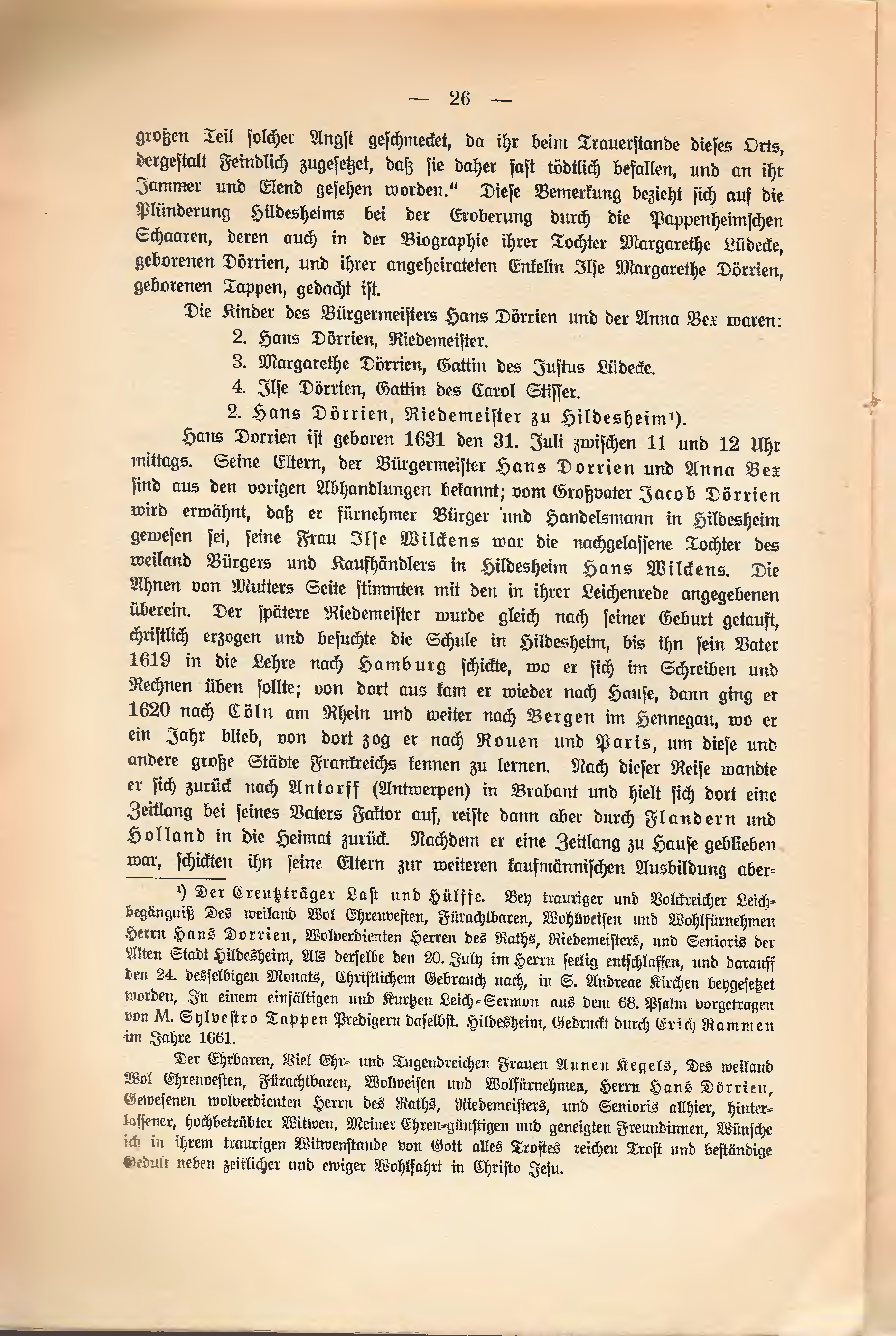 - ↑ Der Creutzträger Last und Hülffe. Bey trauriger und Volckreicher Leichbegängnis Des weiland Wol Ehrenvesten, Fürachtbaren, Wohlweisen und Wohlfürnehmen Herrn Hans Dorrien, Wolverdienten Herren des Raths, Riedemeisters, und Senioris der Alten Stadt Hildesheim, Als derselbe den 20. July im Herrn seelig entschlaffen, und darauff den 24. Desselben Monats, Christlichen Gebrauchs nach, in S. Andreae Kirchen beygesetzet worden, In einem einfältigen und Kurtzen Leich-Sermon aus dem 68. Psalm vorgetragen von M. Sylvestro Tappen Pedigers daselbst. Hildesheim, Gedruckt durch Erich Rammen im Jahre 1661. Der Ehrbaren, Viel Ehr- und Tugendreichen Frauen Annen Kegels, Des weiland Wol Ehrenvesten, Fürachtbaren, Wolweisen und Wolfürnehmen, Herrn Hans Dörrien, Gewesenen wolverdienten Herrn des Raths, Riedemeisters, und Senioris allhier, Wünsche ich in ihrem traurigen Witwenstande von Gott alles Trostes reichen Trost und beständige Gedult neben zeitlichen und ewiger Wohlfahrt in Christo Jesu.
