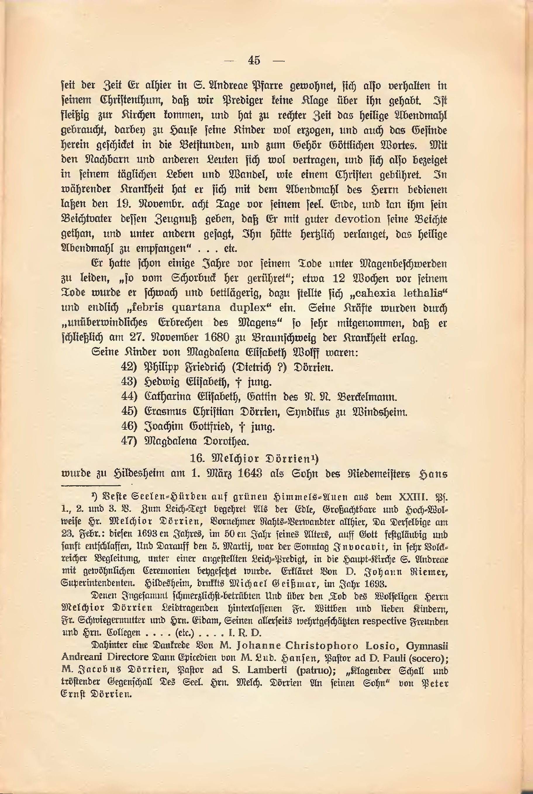 - ↑ Veste Seelen-Hürden auf grünen Himmels-Auen aus dem XXIII. Ps. 1., 2. Und 3. V. Zum Leich-Text begehret Als der Edle, Großachtbare und Hoch-Wolweise Hr. Melchior Dörrien, Vornehmer Raths-Verwandter allhier, Da Derselbige am 23. Febr.: diesen 1693 en Jahres, im 50 en Jahr seines Alters, auff Gott festgläubig und sanft entschlaffen, Und Darauff den 5. Martij, war der Sonntag Invocavit, in sehr Volckreicher Begleitung, unter einer angestellten Leich-Predigt, ind die Haupt-Kirche S. Andreae und gewöhnlichen Ceremonien beygesetzet wurde. Erkläret Von D. Johann Riemer, Superindendenten. Hildesheim, druckts Michael Geißmar, im Jahre 1693.