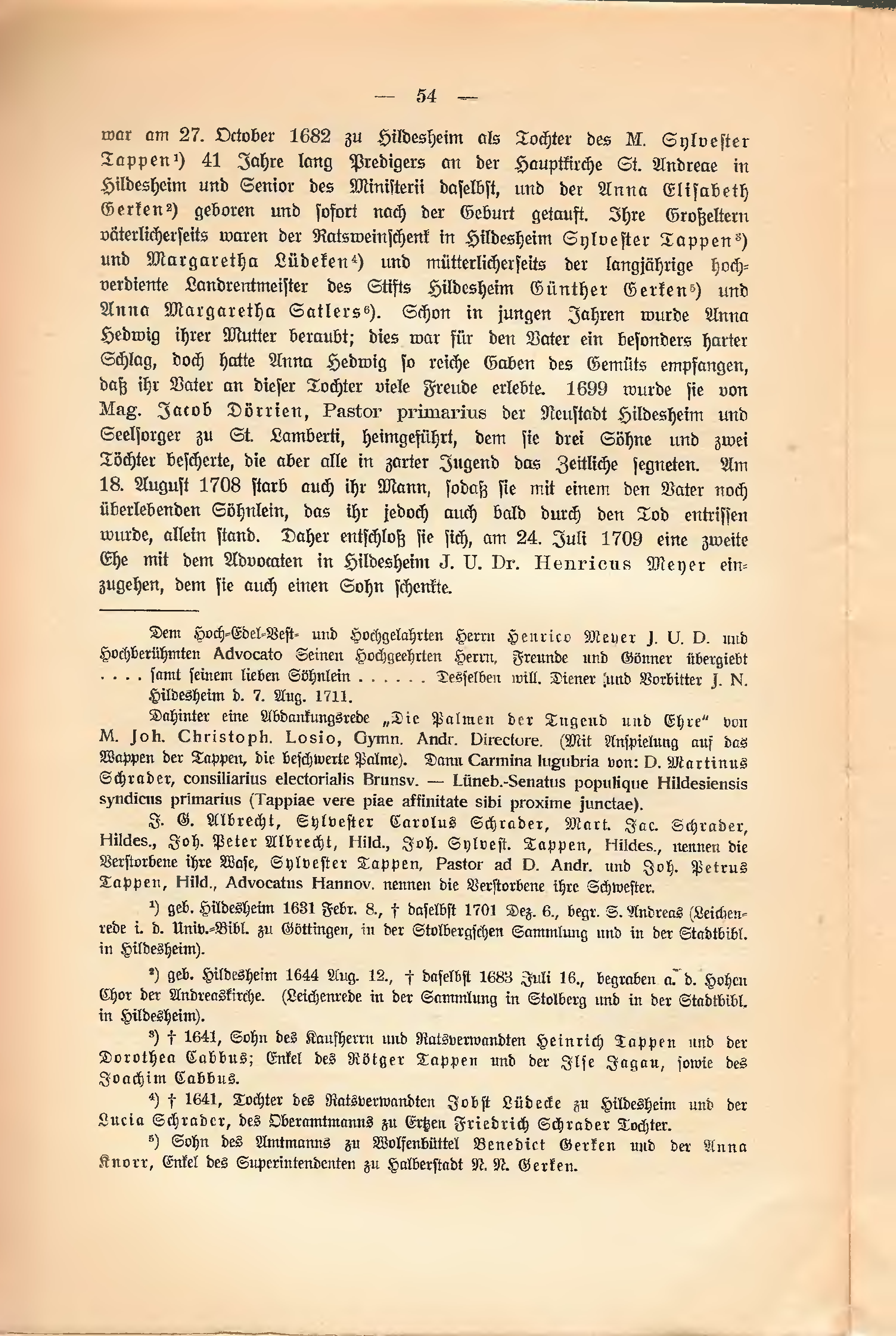 J. G. Albrecht, Sylvester Carolus Schrader, Mart. Jac. Schrader, Hildes., Joh. Peter Albrecht, Hild., Joh. Sylvest. Tappen, Hildes., nennen die Verstorbene ihre Wase, Sylvester Tappen, Pastor a. D. Andr. Und Joh. Petrus Tappen, Hild., Advocatus Hannov. Nennen die Verstorbene ihre Schwester. - ↑ geb. Hildesheim 1631 Febr. 8., + daselbst 1701 Dez. 6., begr. S. Andreas (Leichenrede i. d. Univ.-Bibl. Zu Hildesheim).
