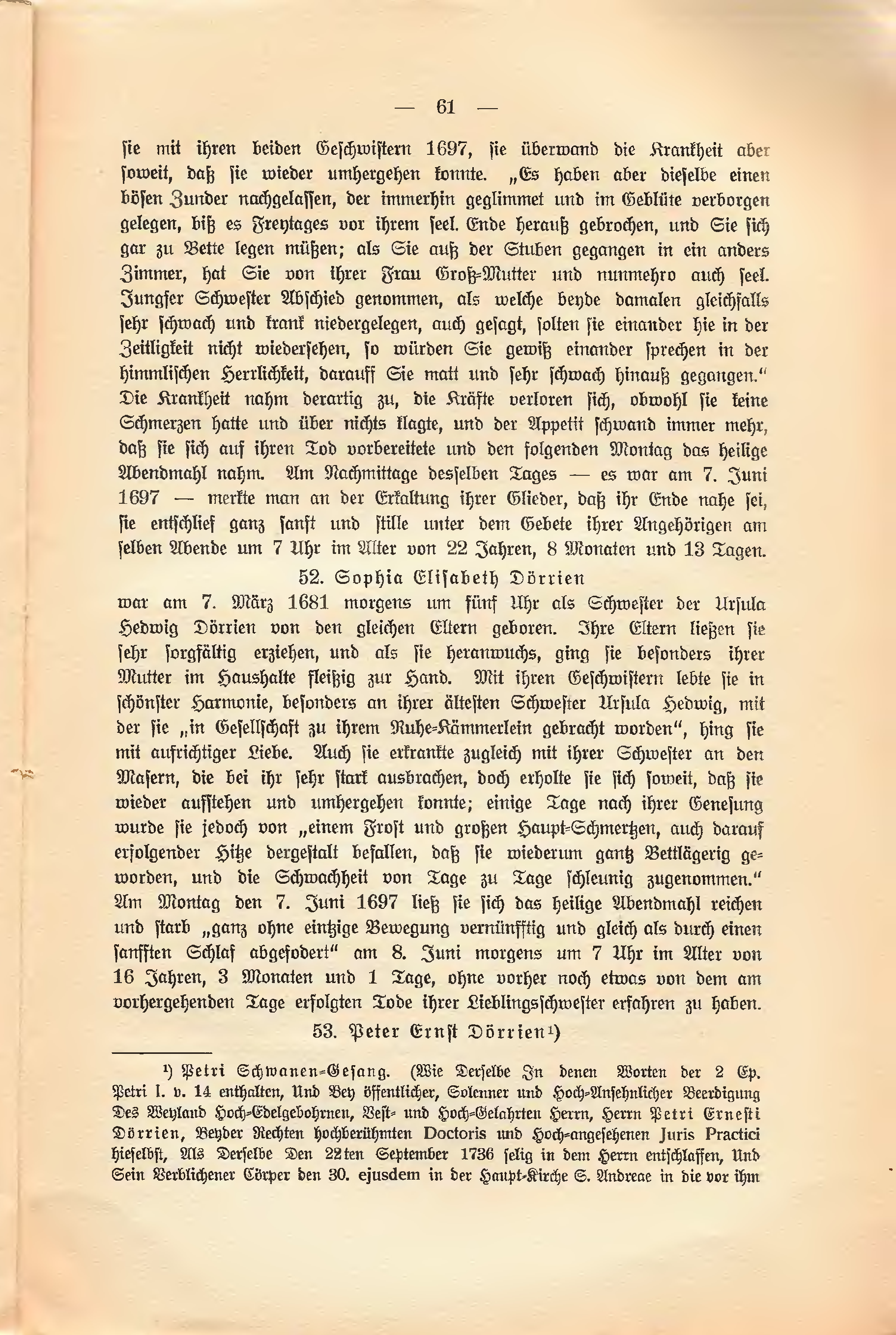 - ↑ Petri Schwanen-Gesang. (Wie Derselbe In denen Worten der 2 Ep. Petri l. v. 14 enthalten, Und Bey öffentlicher, Solenner und Hoch-Ansehnlicher Beerdigung Des Weyland Hoch-Edelgebohrnen, Vest- und Hoch-Gelahrten Herrn, Herrn Petri Ernesti Dörrien, Beyder Rechten hochberühmten Doctoris und Hoch-angesehenen Juris Practici hieselbst, Als Derselbe Den 22ten Septemeber 1736 selig in dem Herrn entschlaffen, Und Sein Verblichener Cörper den 30. Ejusdem in der Haupt-Kirche S. Andreae in die vor ihm zugerichtete Ruhe-Städte beygesetzet wurde, Der gesammten Vornehmen Leide-Tragenden Familie insgemein, Und der Hinterbliebenden schmertzlichst-betrübten Frau Wittwe Insonderheit zur Milderung Ihrer Bekümmerniß, auch Denen übrigen in großer Anzahl versamlet gewesenen Lehr-begierigen Seelen zur kräfftigen Erbauung vorgetragen, von Jacob Friederich Reimman, Superintendenten. Hildesheim, Gedruckt durch J. H. Matthäi, E. Hoch-Edl. Raths privil. Buchdr. Der Hoch-Edelgebohrnen und Tugend-Hochbegabten Frau, Frau Maria Elisabeth Dörrien, Gebohrnen Gerhards, Des Weyland Hoch-Edelgebohrnen, Vest- und Hochgelahrten Herrn, Petri Ernesti Dörrien, Beyder Rechten Hoch-berühmten Doctoris, und Hoch-Angesehenen Juris Practici Hertzlich-geliebten und Theuer-geschätzten Gemahlin überreichet . . . (etc.) . . . Jacob Friedrich Reimmann, Superintendens, Dahinter eine Abdankungsrede: „Das in ein Immerwährendes Solstitium verwandelte Aequinoctium“ von Christian Pantzer, Gymn. Andr. Director.