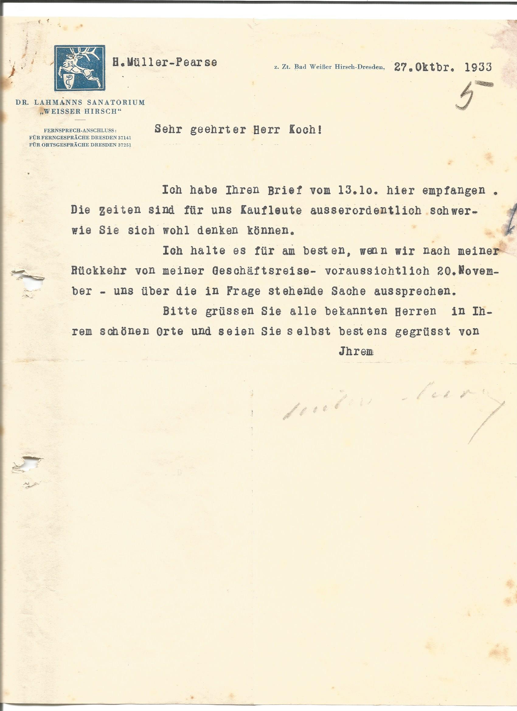 - ↑ Schreiben von H. Müller-Pearse, z. Zt. Bad Weißer Hirsch-Dresden, vom 27. Oktober 1933.