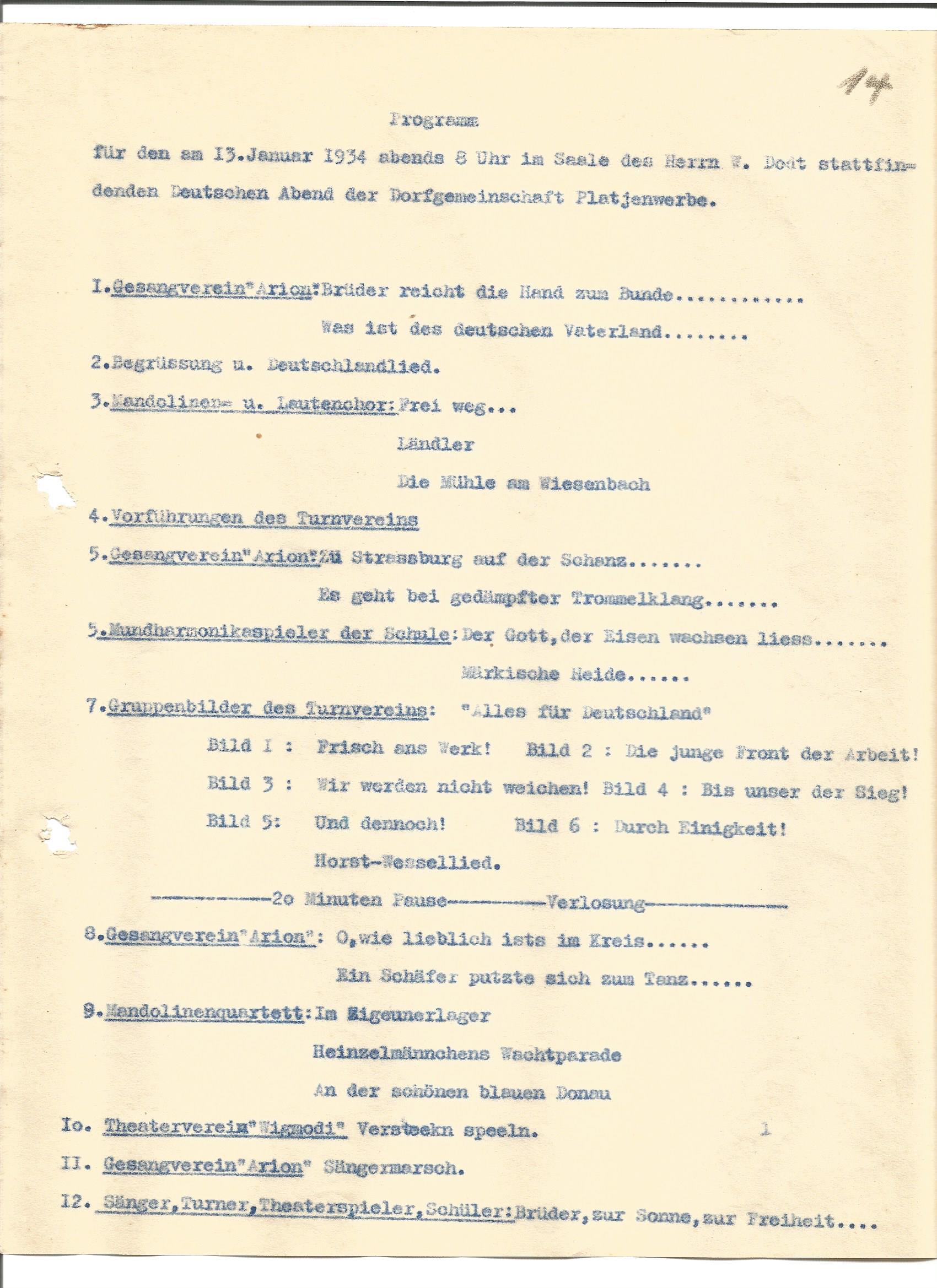 - ↑ Programm für den am 13. Januar 1934 stattfindenden Deutschen Abend der Dorfgemeinschaft Platjenwerbe.