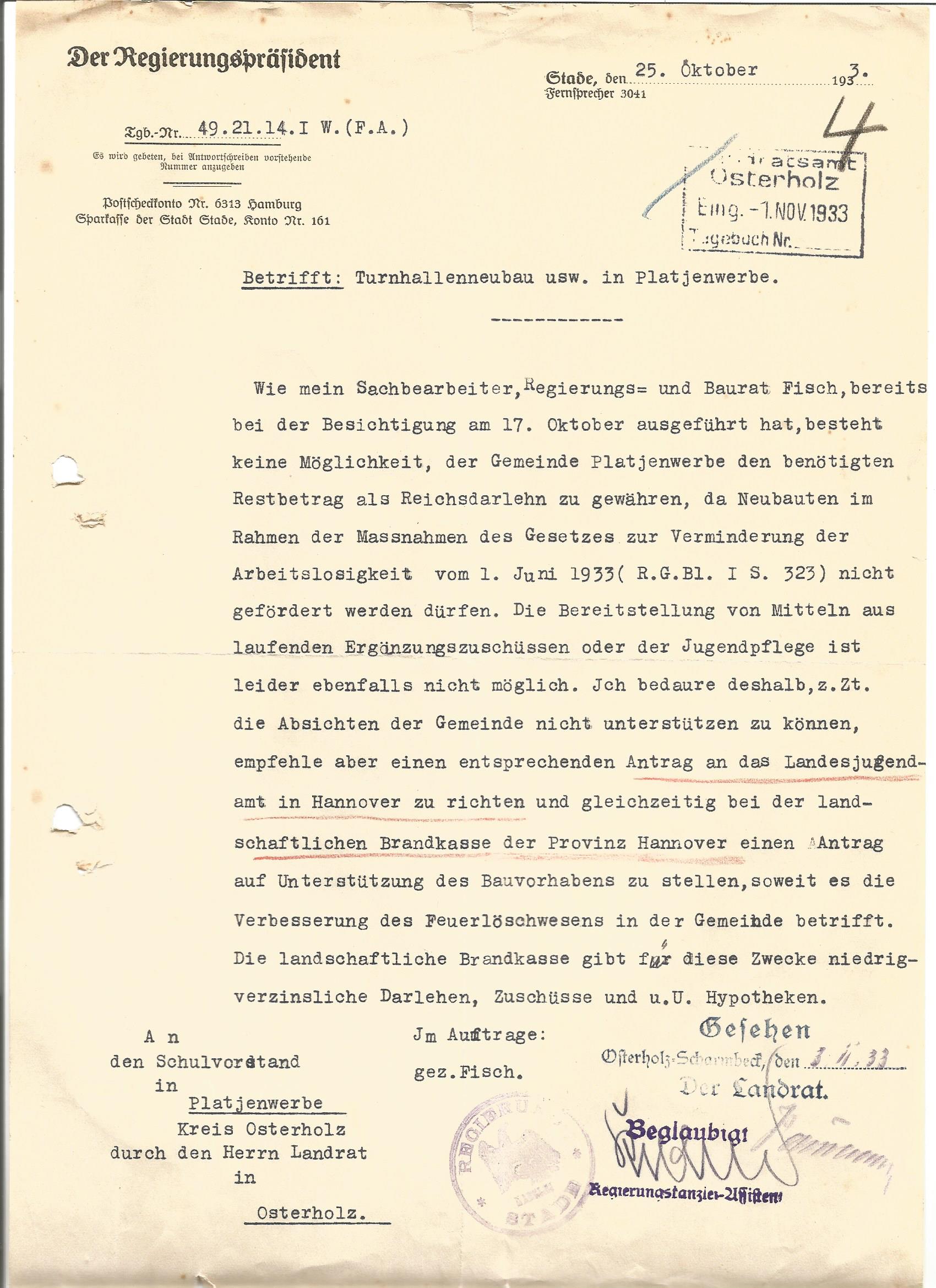 - ↑ Schreiben des Regierungspräsidenten in Stade vom 25. Oktober 1933 an den Schulvorstand Platjenwerbe.