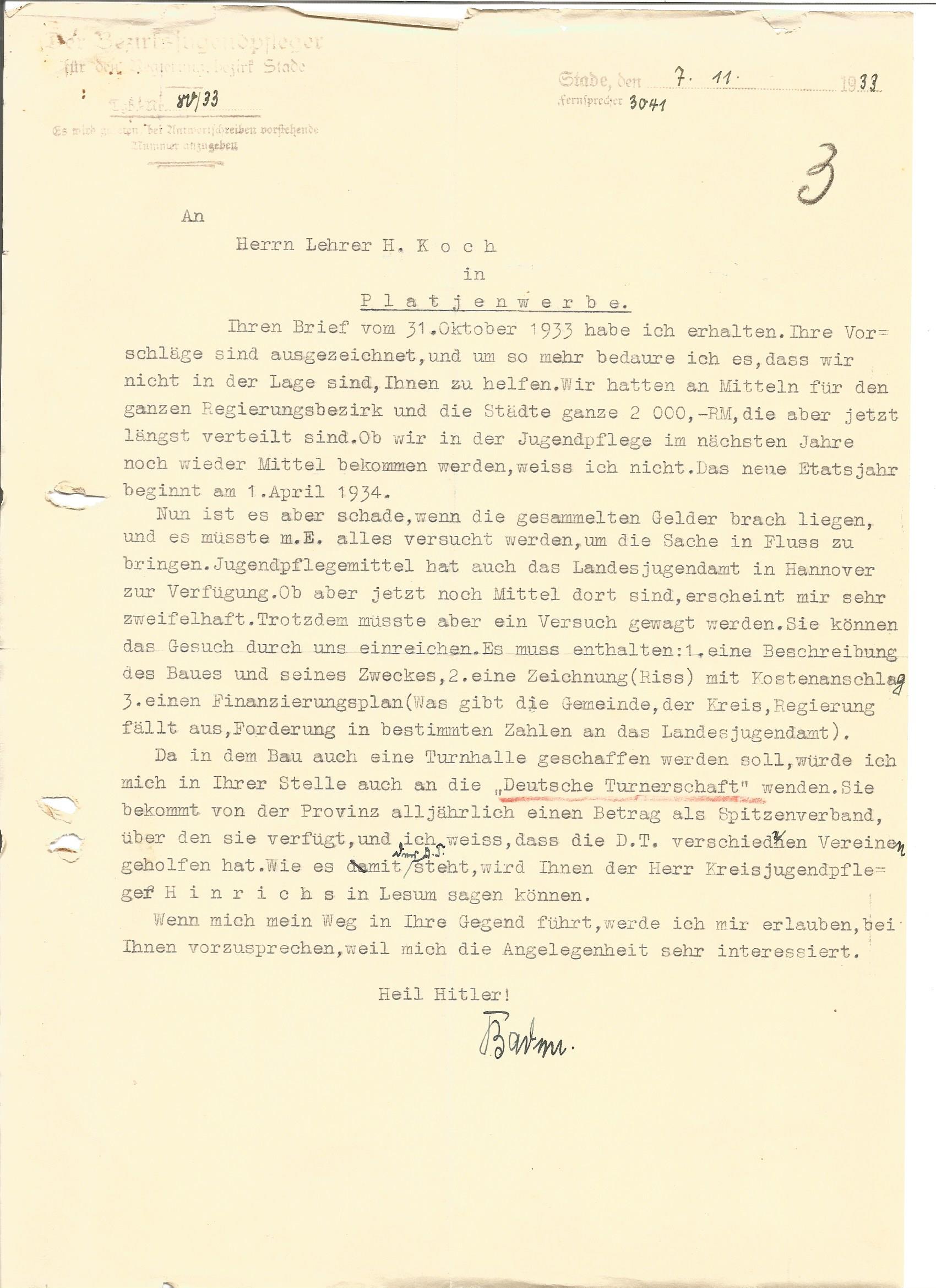 Zu seinem Bedauern mußte auch der Bezirksjungendpfleger negativ antworten, machte mich aber darauf aufmerksam, evtl. eine finanzielle Hilfe durch die „Deutsche Turnerschaft“ zu erhalten.[9][10] Zudem zog ein in Platjenwerbe wohnender Großkaufmann, der uns eine größere Geldspende in Aussicht gestellt hatte, wegen der sich so verschlechterten Wirtschaftslage seine Zusage zurück.[11][12] Den Reichsjugendführer und den Reichsstatthalter für unsere Sache zu gewinnen, blieb ein erfolgloser Versuch.