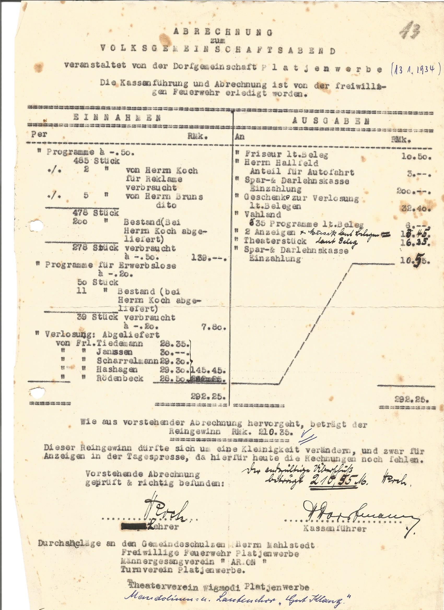 - ↑ Abrechnung zum Volksgemeinschaftsabend der Dorfschaft Platjenwerbe am 13. Januar 1934.