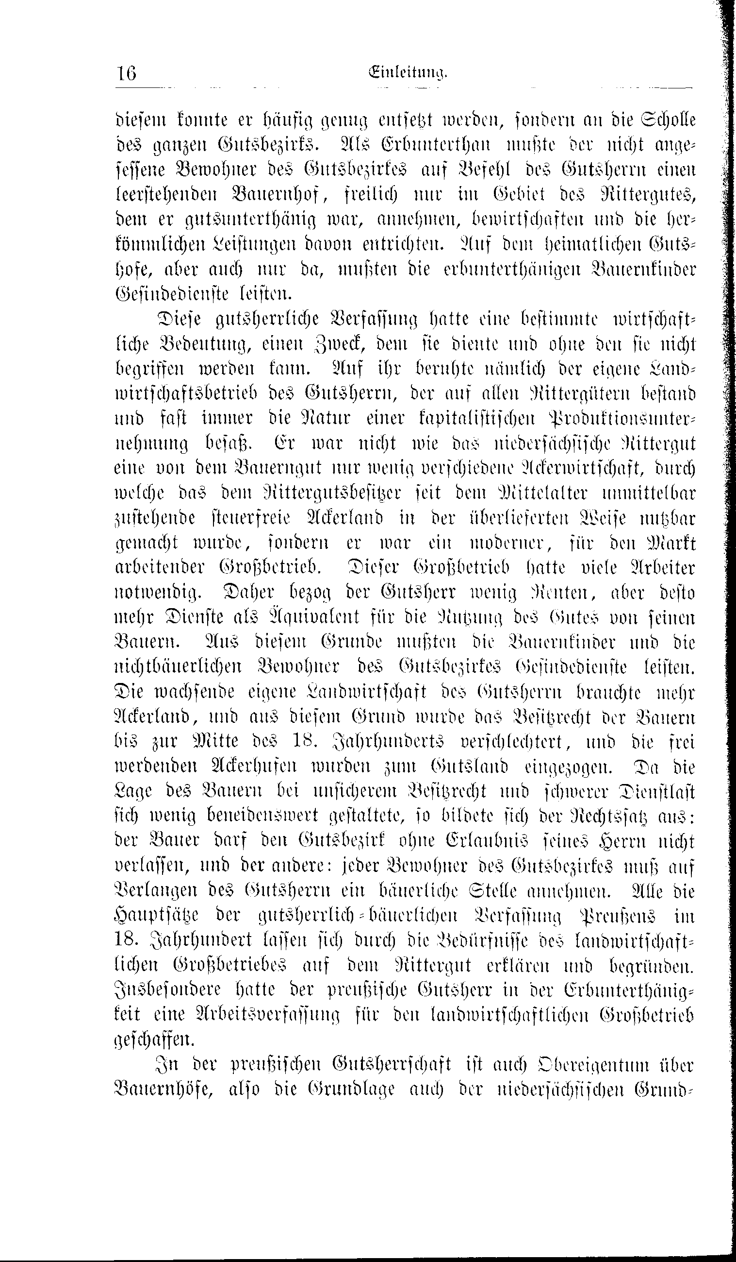 Diese gutsherrliche Verfassung hatte eine bestimmte wirtschaftliche Bedeutung, einen Zweck, dem sie diente und ohne den sie nicht begriffen werden kann. Auf ihr beruhte nämlich der eigene Landwirtschaftsbetrieb des Gutsherrn, der auf allen Rittergütern bestand und fast immer die Natur einer kapitalistischen Produktionsunternehmung besaß. Er war nicht wie das niedersächsische Rittergut eine von dem Bauerngut nur wenig verschiedene Ackerwirtschaft, durch welche das dem Rittergutsbesitzer seit dem Mittelalter unmittelbar zustehende steuerfreie Ackerland in der überlieferten Weise nutzbar gemacht wurde, sondern er war ein moderner, für den Markt arbeitender Großbetrieb. Dieser Großbetrieb hatte viele Arbeiter notwendig. Daher bezog der Gutsherr wenig Renten, aber desto mehr Dienste als Äquivalent für die Nutzung des Gutes von seinen Bauern. Aus diesem Grunde mußten die Bauernkinder und die nichtbäuerlichen Bewohner des Gutsbezirkes Gesindedienste leisten. Die wachsende eigene Landwirtschaft des Gutsherrn brauchte mehr Ackerland, und aus diesem Grund wurde das Besitzrecht der Bauern bis zur Mitte des 18. Jahrhunderts verschlechtert, und die frei werdenden Ackerhufen wurden zum Gutsland eingezogen. Da die Lage des Bauern bei unsicherem Besitzrecht und schwerer Dienstlast sich wenig beneidenswert gestaltete, so bildete sich der Rechtssatz aus: der Bauer darf den Gutsbezirk ohne Erlaubnis seines Herrn nicht verlassen, und der andere: jeder Bewohner des Gutsbezirkes muß auf Verlangen des Gutsherrn eine bäuerliche Stelle annehmen. Alle die Hauptsätze der gutsherrlich-bäuerlichen Verfassung Preußens im 18. Jahrhundert lassen sich durch die Bedürfnisse des landwirtschaftlichen Großbetriebes auf dem Rittergut erklären und begründen. Insbesondere hatte der preußische Gutsherr in der Erbunterthänigkeit eine Arbeitsverfassung für den landwirtschaftlichen Großbetrieb geschaffen.