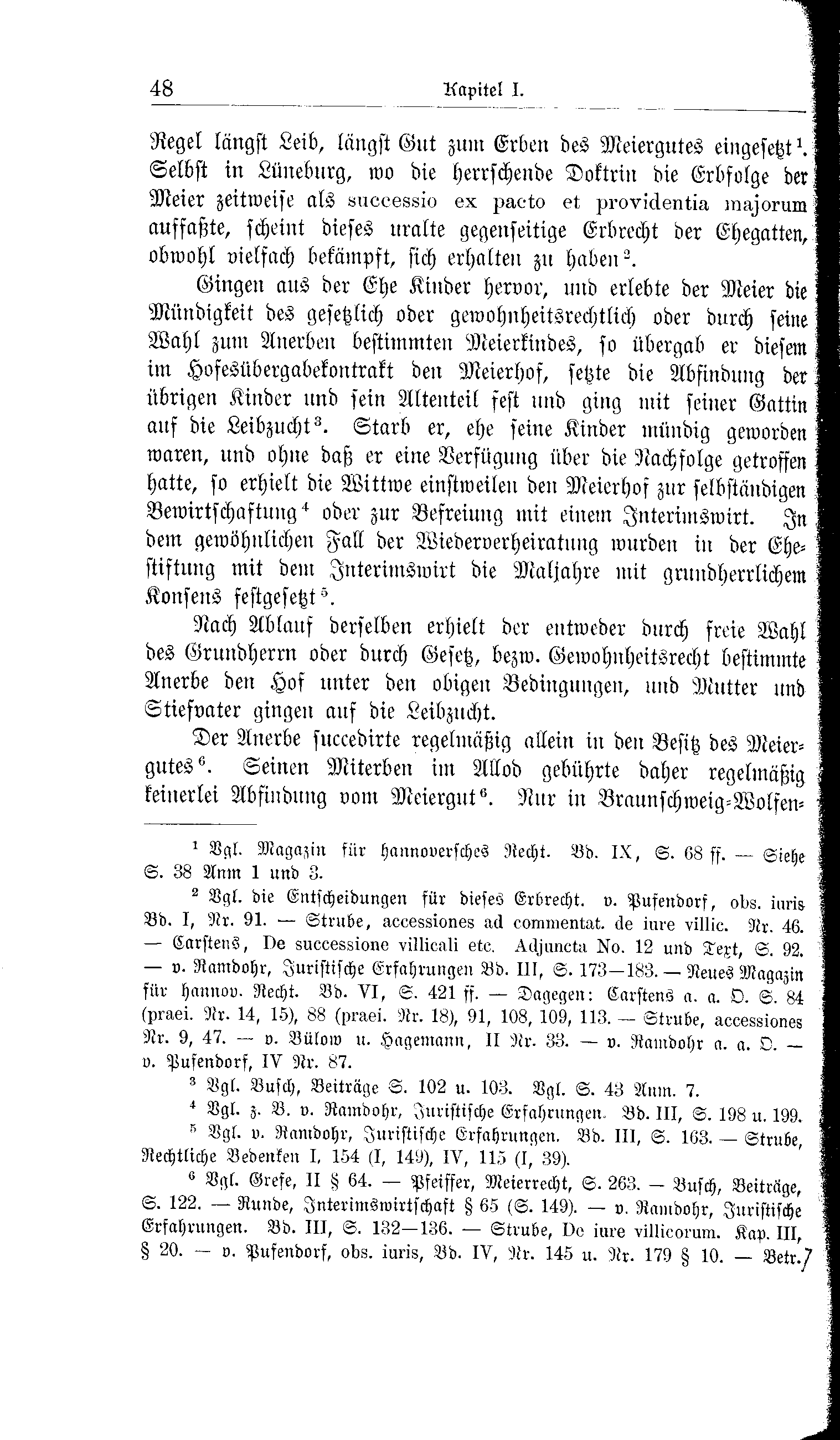Regel längst Leib, längst Gut zum Erben des Meiergutes eingesetzt.[1] Selbst in Lüneburg, wo die herrschende Doktrin die Erbfolge der Meier zeitweise als successio ex pacto et providentia majorum auffaßte, scheint dieses uralte gegenseitige Erbrecht der Ehegatten, obwohl vielfach bekämpft, sich erhalten zu haben.[2]