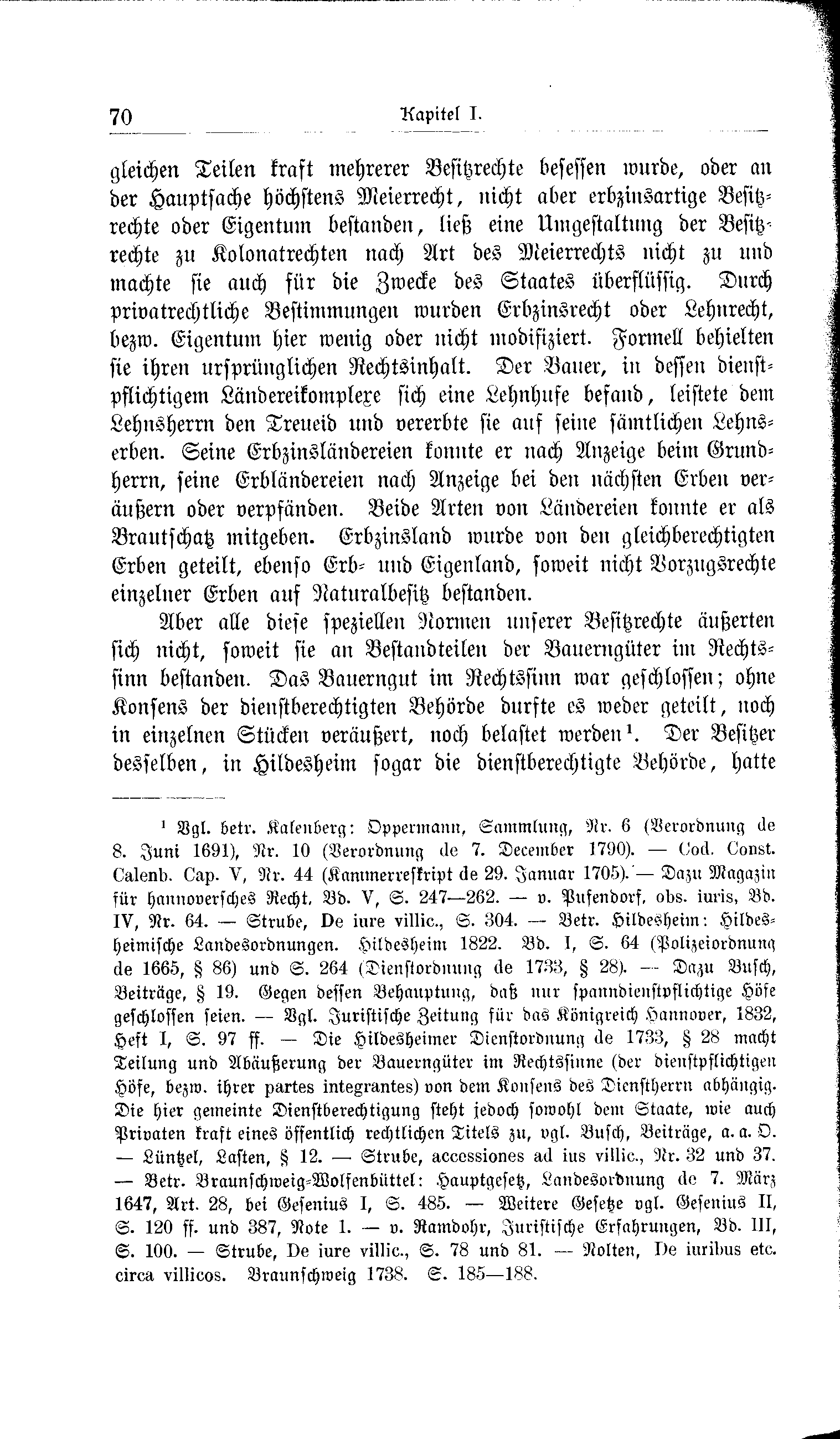 gleichen Teilen kraft mehrerer Besitzrechte besessen wurde, oder an der Hauptsache höchstens Meierrecht, nicht aber erbzinsartige Besitzrechte oder Eigentum bestanden, ließ eine Umgestaltung der Besitz' rechte zu Kolonatrechten nach Art des Meierrechts nicht zu und machte sie auch für die Zwecke des Staates überflüssig. Durch privatrechtliche Bestimmungen wurden Erbzinsrecht oder Lehnrecht, bezw. Eigentum hier wenig oder nicht modifiziert. Formell behielten sie ihren ursprünglichen Rechtsinhalt. Der Bauer, in dessen dienstpflichtigem Ländereikomplexe sich eine Lehnhufe befand, leistete dem Lehnsherrn den Treueid und vererbte sie auf feine fämtlichen Lehnserben. Seine Erbzinslandereien konnte er nach Anzeige beim Grundherrn, seine Erbländereien nach Anzeige bei den nächsten Erben veräußern oder verpfänden. Beide Arten von Ländereien konnte er als Brautfchatz mitgeben. Erbzinsland wurde von den gleichberechtigten Erben geteilt, ebenso Erb- und Eigenland, soweit nicht Vorzugsrechte einzelner Erben auf Naturalbesitz bestanden. Aber alle diese speziellen Normen unserer Besitzrechte äußerten sich nicht, soweit sie an Bestandteilen der Bauerngüter im Rechtssinn bestanden. Das Bauerngut im Rechtssinn war geschlossen; ohne Konsens der dienstberechtigten Behörde durfte es weder geteilt, noch in einzelnen Stücken veräußert, noch belastet werden'. Der Besitzer desselben, in Hildesheim sogar die dienstberechtigte Behörde, hatte i Vgl. betr. Kalenberg: Oppermann, Sammlung, Nr, 6 (Verordnung c!« 8. Juni 1691), Nr, 10 (Verordnung de 7. December 1790). — Loä, Con8t. Oalküb, <üaz>. V, Nr. 44 (Kammerrestript äs 29. Januar 1705)/— Dazu Magazin für hannoversches Recht, Nd. V, S. 247—262. — v. Pufendorf, ow. iuriz, Bd, IV, Nr. 64. — Strube, De iurs villie., S. 304. — Betr. Hildesheim: Hildesheimische Landesordnungen. Hildesheim 1822. Bd. I, S. 64 (Polizeiordnuna äs 1665, tz 86) und S. 264 (Dienstordnung äe 1783, § 28). — Dazu Busch, Beitrage, ß 19. Gegen dessen Behauptung, daß nur spanndienstpflichtige Höfe geschlossen seien. — Vgl. Juristische Zeitung für das Königreich Hannover, 1832, Heft I, S. 9? ff. — Die Hildesheimer Dienstordnung <Is 1733, z 28 macht Teilung und Abäußerung der Bauerngüter im Rechtssinne (der dienstpflichtigen Höfe, bezw. ihrer partW ints^rantsz) von dem Konsens des Dienstherr!! abhängig. Die hier gemeinte Dienstberechtigung steht jedoch sowohl dem Staate, wie auch Privaten kraft eines öffentlich rechtlichen Titels zu, vgl. Busch, Beiträge, a. a. O, — Lüntzel, Lasten, § 12. — Strube, »oeezzionsz aä ili8 vülie,, Nr. 32 und 37, — Betr. Braunschweig-Wolfenbüttel: Hauptgesetz, Landesorbnung ä« 7. März 1647, Art. 28, bei Gesenius I, S. 485. — Weitere Gesetze vgl. Gesenius II, S. 120 ff. und 387, Note I. — v. Ramdohr, Juristische Erfahrungen, Bd. III, S. 100. — Strube, vs iure villie., S. 78 und 81. — Nolten, De iulilm« ete. eiroa villioos. Braunschweig 1738. S. 185—188,