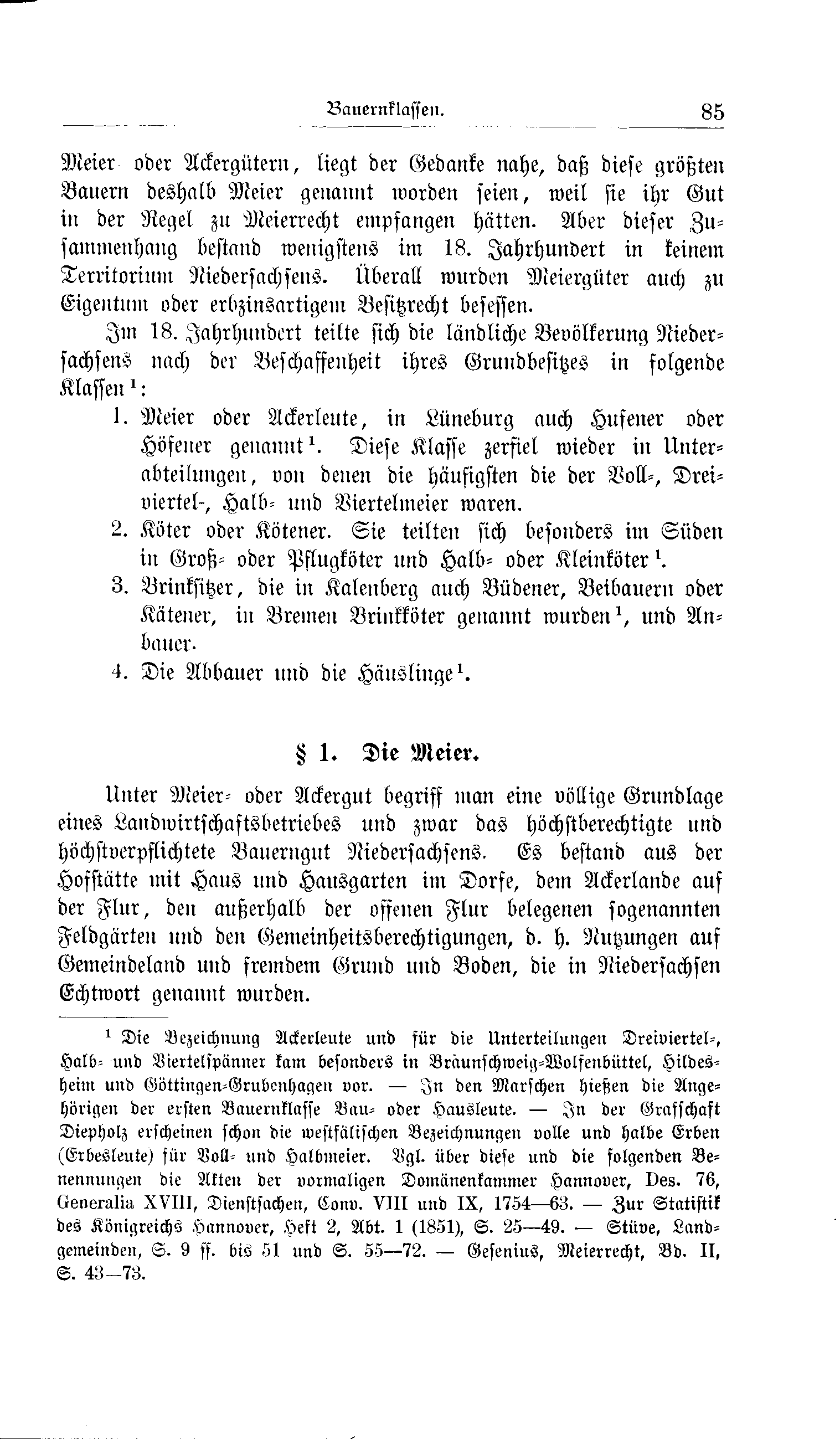 ! Die Bezeichnung Ackerleute und für die Unterteilungen Dreiviertel-, Halb- und Viertelspänner kam besonders in Braunschweig-Wolfenbüttel, Hildesheim und Göttingen-Grubenhagen vor. — In den Marschen hießen die Angehörigen der ersten Naueinklafse Bau- oder Hausleute, — In der Grafschaft Diepholz erscheinen schon die westfälischen Bezeichnungen volle und halbe Erben (Erbesleute) für Voll- und Halbmeier. Vgl. über diese und die folgenden Benennungen die Alten der vormaligen Domänenkammer Hannover, Des. 76, oensraiia XVIII, Dienstsachen, Conv. VIII und IX, 1754—63. — Zur Statistik des Königreichs Hannover, Heft 2, Abt. 1 (1851), S. 25—49. — Stüve, Landgemeinden, S. 9 ff. bis 51 und S. 55—72. — Gesenius, Meierrecht, Vd. II, S. 43-73.