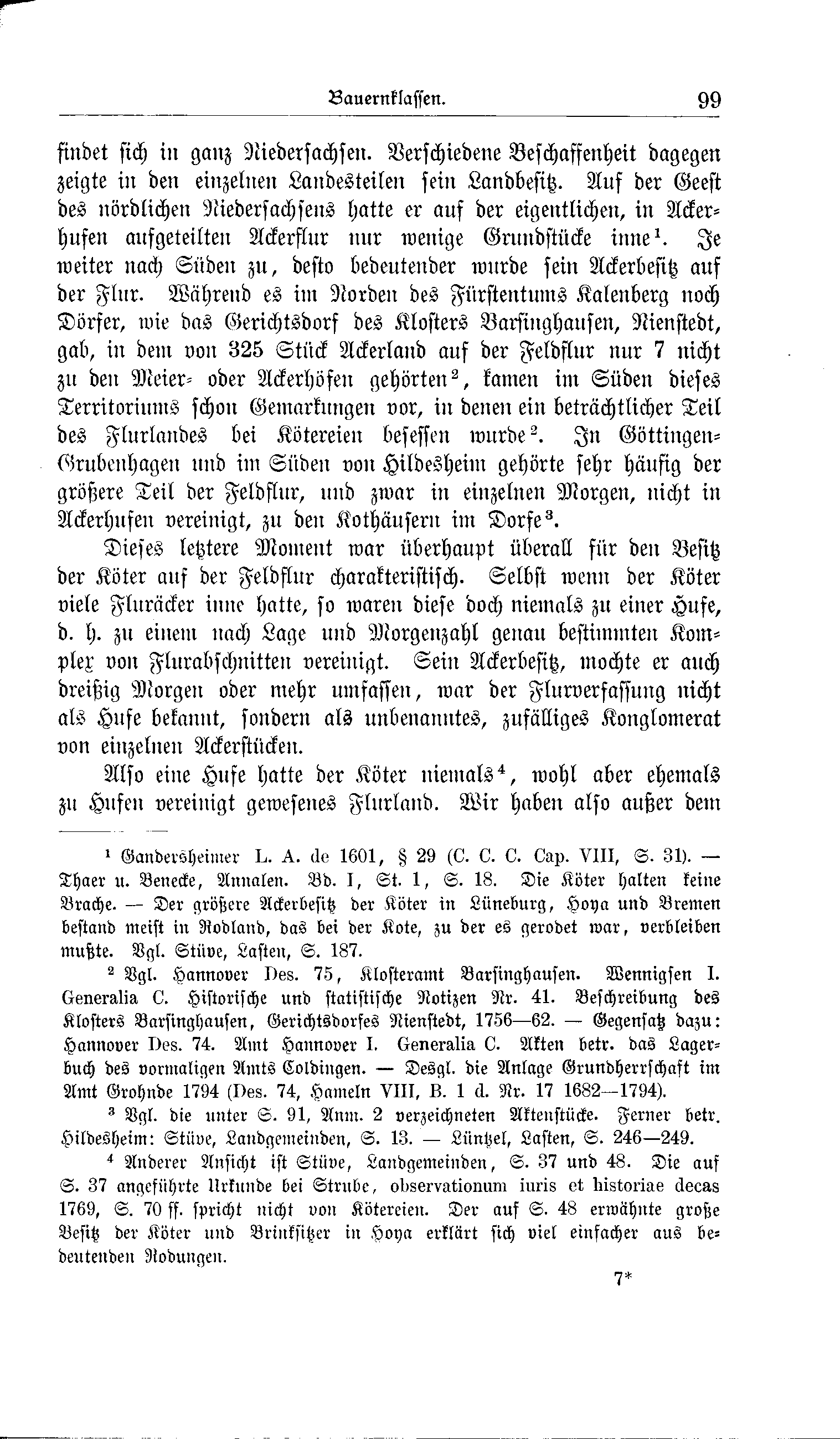 findet sich in ganz Niedersachsen. Verschiedene Beschaffenheit dagegen zeigte in den einzelnen Landesteilen sein Landbesitz. Auf der Geest des nördlichen Niedersachsens hatte er auf der eigentlichen, in Ackerhufen aufgeteilten Ackerflur nur wenige Grundstücke inne'. Je weiter nach Süden zu, desto bedeutender wurde sein Ackerbesitz auf der Flur. Während es im Norden des Fürstentums Kalenberg noch Dörfer, wie das Gerichtsdorf des Klosters Varsinghausen, Nienstedt, gab, in dem von 325 Stück Ackerland auf der Feldftur nur 7 nicht zu den Meier- oder Ackerhöfen gehörten ^, kamen im Süden dieses Territoriums schon Gemarkungen vor, in denen ein beträchtlicher Teil des Flurlandes bei Kötereien besessen wurdet In Göttingen-Grubenhagen und im Süden von Hildesheim gehörte sehr häufig der größere Teil der Feldflur, und zwar in einzelnen Morgen, nicht in Ackerhufen vereinigt, zu den Kothäusern im Dorfe".