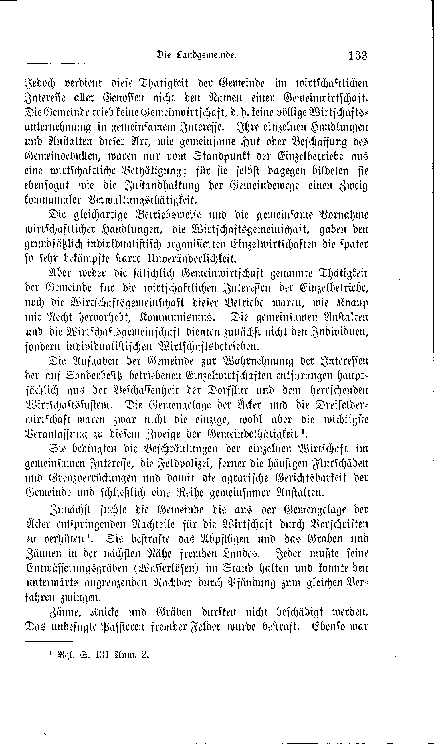 Jedoch verdient diese Thätigkeit der Gemeinde im wirtschaftlichen Interesse aller Genossen nicht den Namen einer Gemeinwirtschaft. Die Gemeinde trieb keine Gemeinwirtschaft, d.h. keine völlige Wirtschafts-unternehmung in gemeinsamem Interesse. Ihre einzelnen Handlungen und Anstalten dieser Art, wie gemeinsame Hut oder Beschaffung des Gemeindebullen, waren nur vom Standpunkt der Einzelbetriebe aus eine wirtschaftliche Vethätigung; für sie selbst dagegen bildeten sie ebensogut wie die Instandhaltung der Gemeindewege einen Zweig kommunaler Verwaltungsthätigkeit.