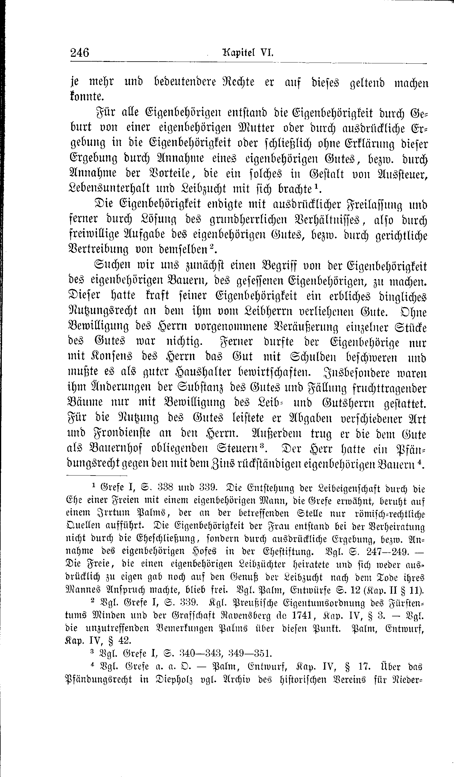 ^ Grefe I, S, 338 und 839. Die Entstehung der Leibeigenschaft durch die Ehe einer Freien mit einem eigenbehörigen Mann, die Grefe erwähnt, beruht auf einem Irrtum Palms, der an der betreffenden Stelle nur römisch-rechtliche Quelle» aufführt. Die Eigenbehörigkeit der Frau entstand bei der Verheiratung nicht durch die Eheschließung, sondern durch ausdrückliche Ergebung, bezw. Annahme des eigenbehörigen Hofes in der Ehestiftung. Vgl. S, 247—249. — Die Freie, die einen eigenbehörigen Leibzüchter heiratete und sich weder aus» drücklich zu eigen gab noch auf den Genuß der Leibzucht nach dem Tode ihres Mannes Anspruch machte, blieb frei. Vgl. Palm, Entwürfe S. 12 (Kap. II § 11),