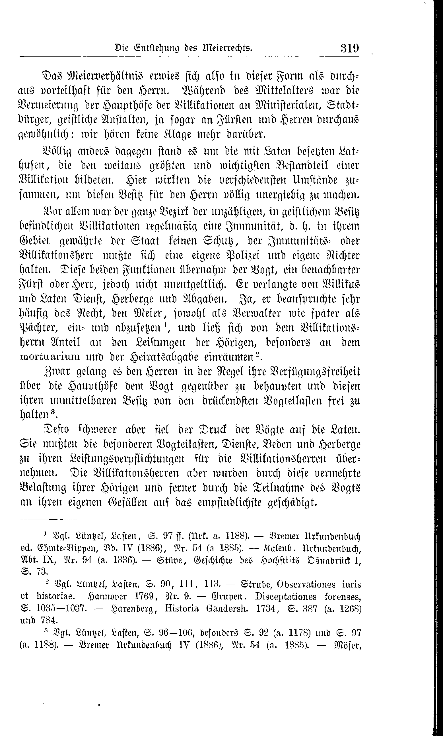 Vor allem war der ganze Bezirk der unzähligen, in geistlichem Besitz befindlichen Villikationen regelmäßig eine Immunität, d. h, in ihrem Gebiet gewährte der Staat keinen Schutz, der Immunitats- oder Villikationsherr mußte sich eine eigene Polizei und eigene Richter halten. Diese beiden Funktionen übernahm der Vogt, ein benachbarter Fürst oder Herr, jedoch nicht unentgeltlich. Er verlangte von Villikus und Laten Dienst, Herberge und Abgaben. Ja, er beanspruchte sehr häufig das Recht, den Meier, sowohl als Verwalter wie später als Pächter, ein- und abzusetzen^, und ließ sich von dem Villikations-herm Anteil an den Leistungen der Hörigen, besonders an dem luortuarinin und der Heiratsabgabe einräumend
