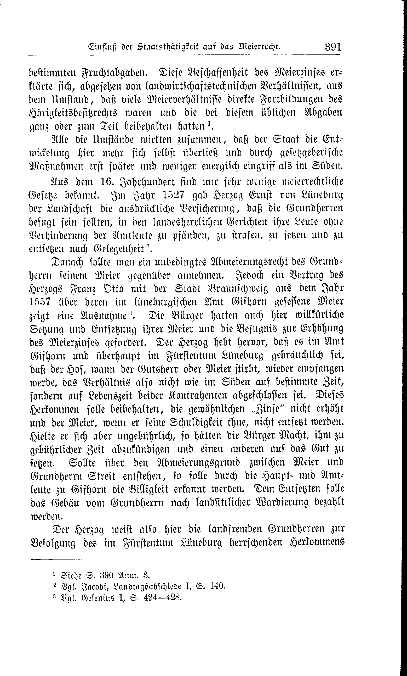 Danach sollte man ein unbedingtes Abmeierungsrecht des Grundherrn seinem Meier gegenüber annehmen. Jedoch ein Vertrag des Herzogs Franz Otto mit der Stadt Vraunschweig aus dem Jahr 155? über deren im lüneburgischen Amt Gifhorn gesessene Meier zeigt eine Ausnahme ^. Die Bürger hatten auch hier willkürliche Setzung und Entsetzung ihrer Meier und die Befugnis zur Erhöhung des Meierzinses gefordert. Der Herzog hebt hervor, daß es im Amt Gifhorn und überhaupt im Fürstentum Lüneburg gebräuchlich sei, daß der Hof, wann der Gutsherr oder Meier stirbt, wieder empfangen werde, das Verhältnis also nicht wie im Süden auf bestimmte Zeit, sondern auf Lebenszeit beider Kontrahenten abgeschlossen sei. Dieses Herkommen solle beibehalten, die gewöhnlichen „Zinse‟ nicht erhöht und der Meier, wenn er seine Schuldigkeit thue, nicht entsetzt werden. Hielte er sich aber ungebührlich, so hätten die Bürger Macht, ihm zu gebührlicher Zeit abzukündigen und einen anderen auf das Gut zn setzen. Sollte über den Abmeierungsgnmd zwischen Meier und Grundherrn Streit entstehen, so solle durch die Haupt- und Amtleute zu Gifhorn die Billigkeit erkannt werden. Dem Entsetzten solle das Gebau vom Grundherrn nach landsittlicher Markierung bezahlt werden.