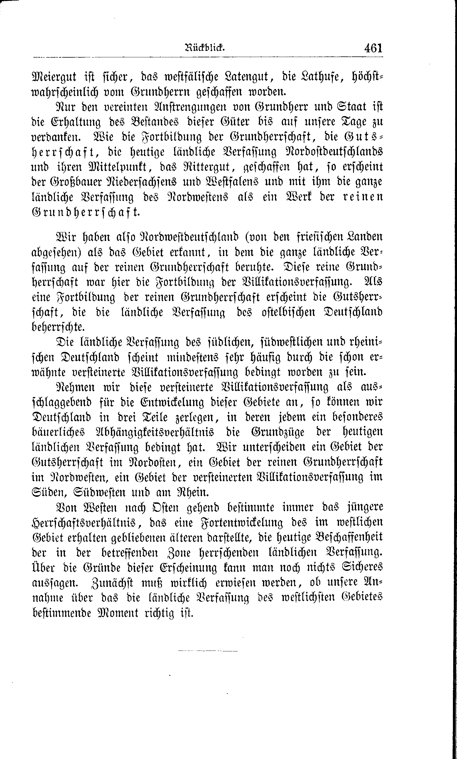 Nehmen wir diese versteinerte Villikationsverfassung als ausschlaggebend für die Entwicklung dieser Gebiete an, so können wir Deutschland in drei Teile zerlegen, in deren jedem ein besonderes bäuerliches Abhängigkeitsverhältnis die Grundzüge der heutigen ländlichen Verfassung bedingt hat. Wir unterscheiden ein Gebiet der Gutsherrschaft im Nordosten, ein Gebiet der reinen Grundherrschaft im Nordwesten, ein Gebiet der versteinerten Villikationsverfassung im Süden, Südwesten und am Rhein.