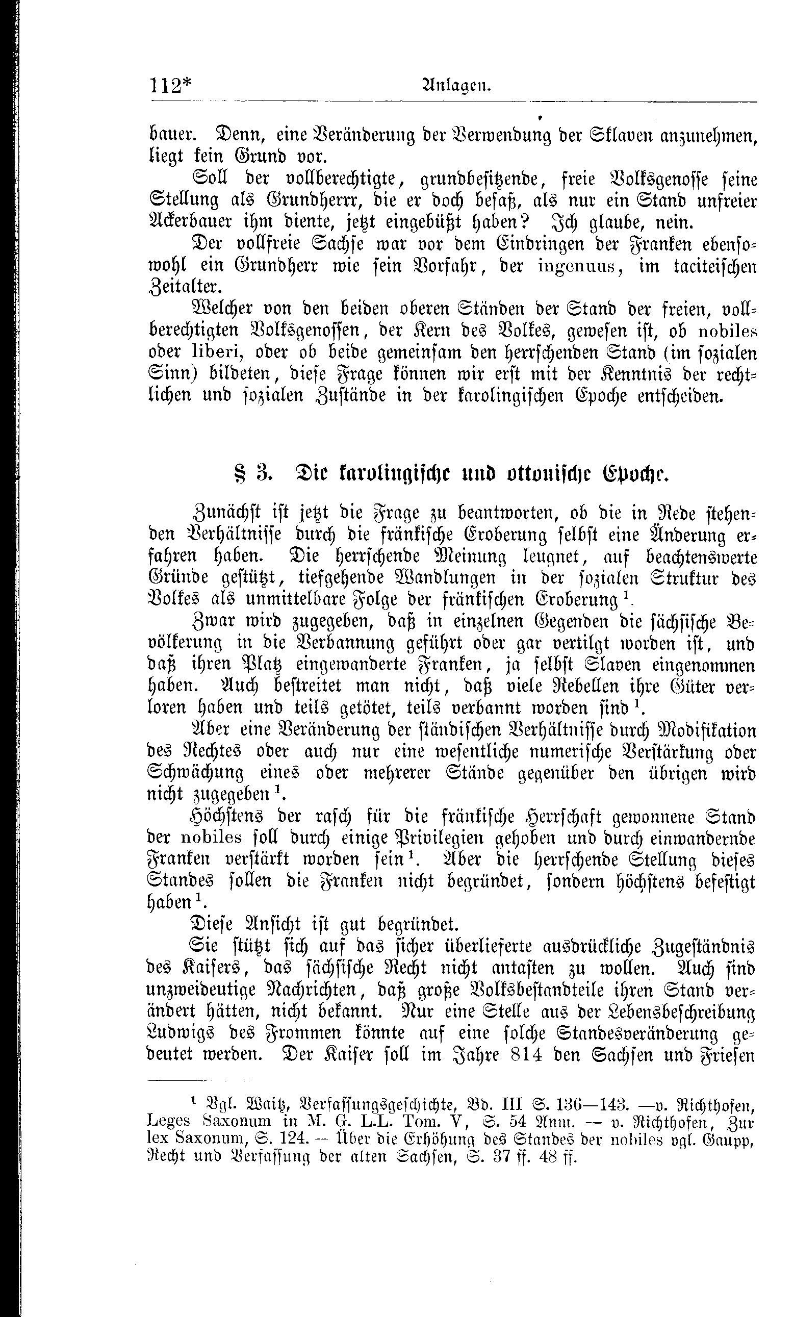 Zunächst ist jetzt die Frage zu beantworten, ob die in Rede stehenden Verhältnisse durch die fränkische Eroberung selbst eine Änderung erfahren haben. Die herrschende Meinung leugnet, auf beachtenswerte Gründe gestützt, tiefgehende Wandlungen in der sozialen Struktur des Volkes als unmittelbare Folge der fränkischen Eroberung.[1]