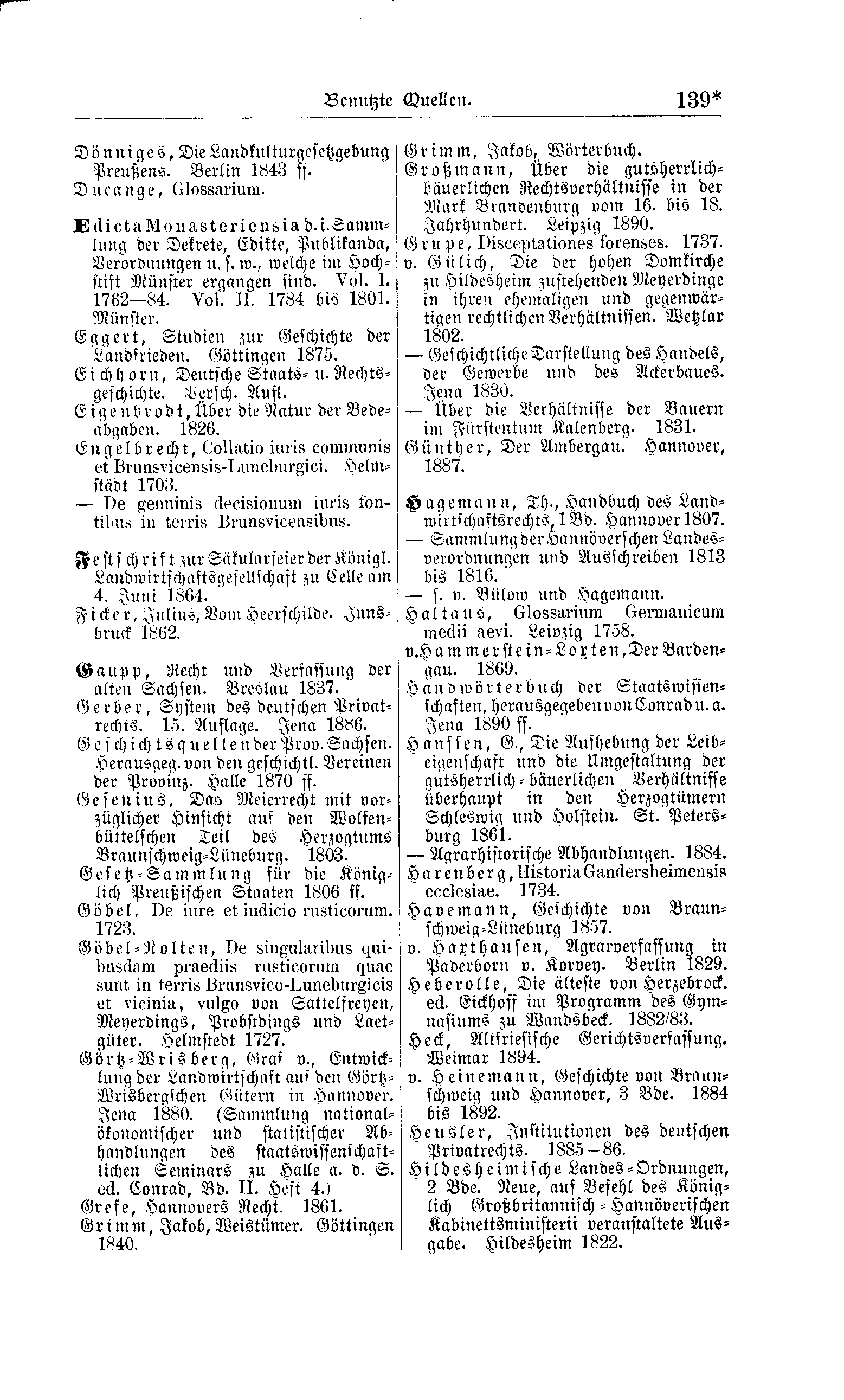 Gerber, System des deutschen Privatrechts. 15. Auflage. Jena 1886. Geschichtsquellen der Prov. Sachsen. Herausgeg. von den geschichtl. Vereinen der Provinz. Halle 1870 ff. Gesenius, Das Meierrecht mit vorzüglicher Hinsicht auf den Wolfenbüttelschen Teil des Herzogtums Braunschweig-Lüneburg. 1803. Gesetz-Sammlung für die Königlich Preußischen Staaten 1806 ff. Göbel, De iure et iudicio rusticorum. 1723. Göbel-Nolten, De singularibus quibusdam praediis rusticorum quae sunt in terris Brunsvico-Luneburgicis et vicinia, vulgo von Sattelfreyen, Meyerdings, Probstdings und Laetgüter. Helmstedt 1727. Görtz-Wrisberg, Graf v., Entwicklung der Landwirtschaft auf den Görtz-Wrisbergschen Gütern in Hannover. Jena 1880. (Sammlung nationalökonomischer und statistischer Abhandlungen des staatswissenschaftlichen Seminars zu Halle a.d.S. ed. Conrad, Bd.II. Heft 4.) Grefe, Hannovers Recht. 1861. Grimm, Jakob, Weistümer. Göttingen 1840. |