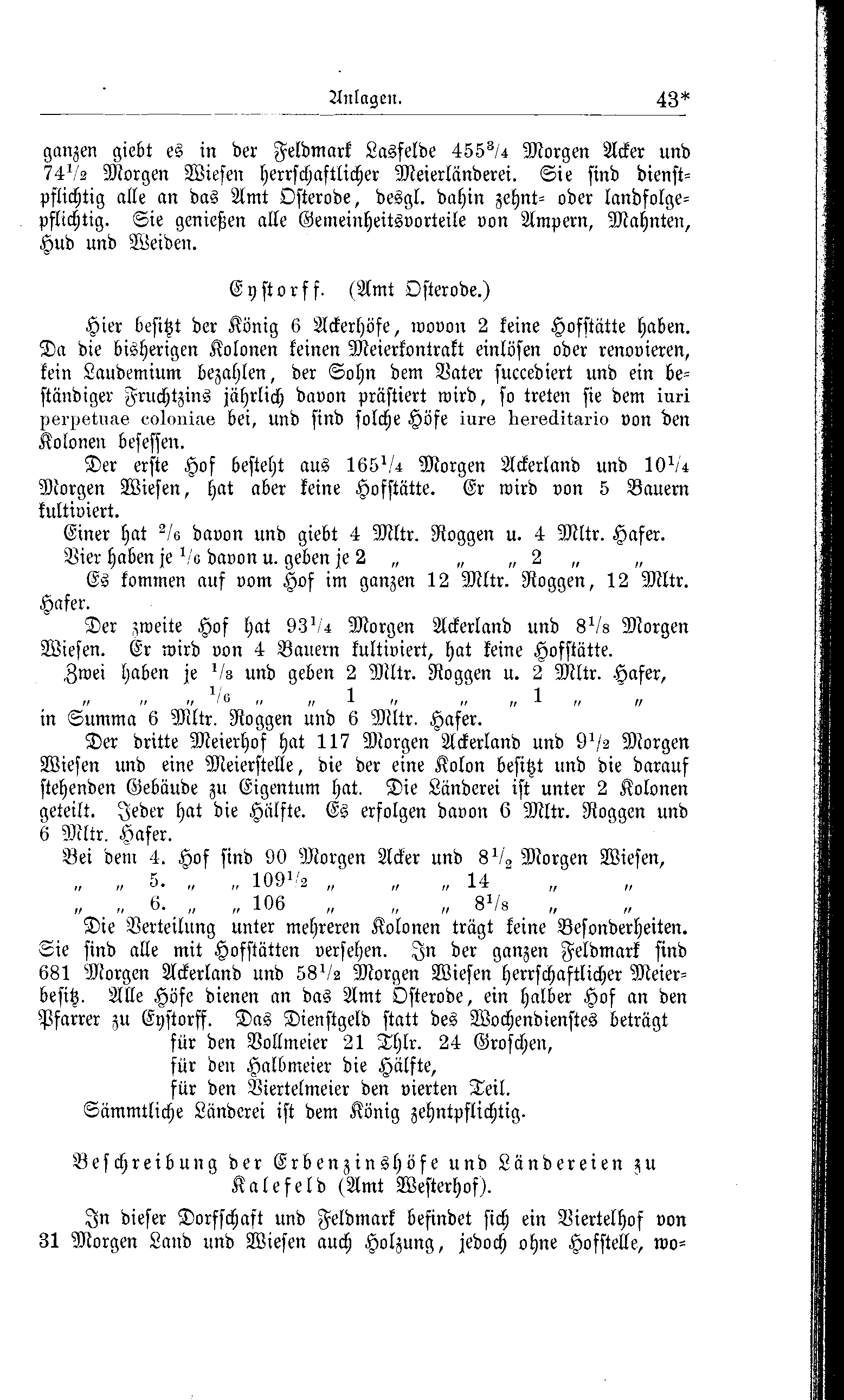 Die Verteilung unter mehreren Kolonen trägt keine Besonderheiten. Sie sind alle mit Hofstätten versehen. In der ganzen Feldmark sind 681 Morgen Ackerland und 58^2 Morgen Wiesen herrschaftlicher Meierbesitz, Alle Höfe dienen an das Amt Osterode, ein halber Hof an den Pfarrer zu Eystorff. Das Dienstgeld statt des Wochendienstes beträgt für den Vollmeier 21 Thlr. 24 Groschen, für den Halbmeier die Hälfte, für den Viertelmeier den vierten Teil. Sämmtliche Ländcrei ist dem König zehntpflichtig.