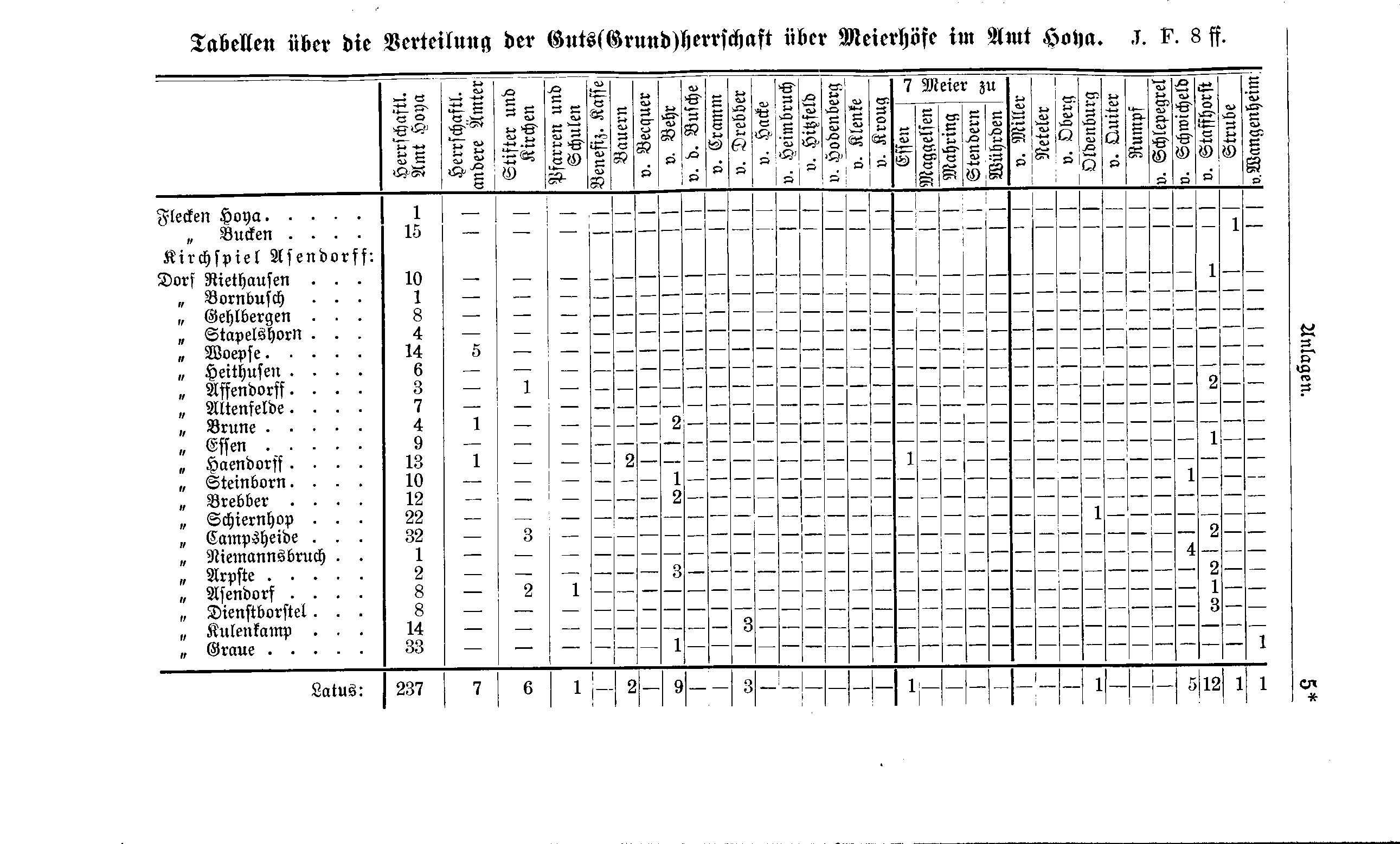 Tabellen über die Verteilung der Guts(Grund)herrschaft über Meierhöfe im Amt Hoya. J.F.8 ff.