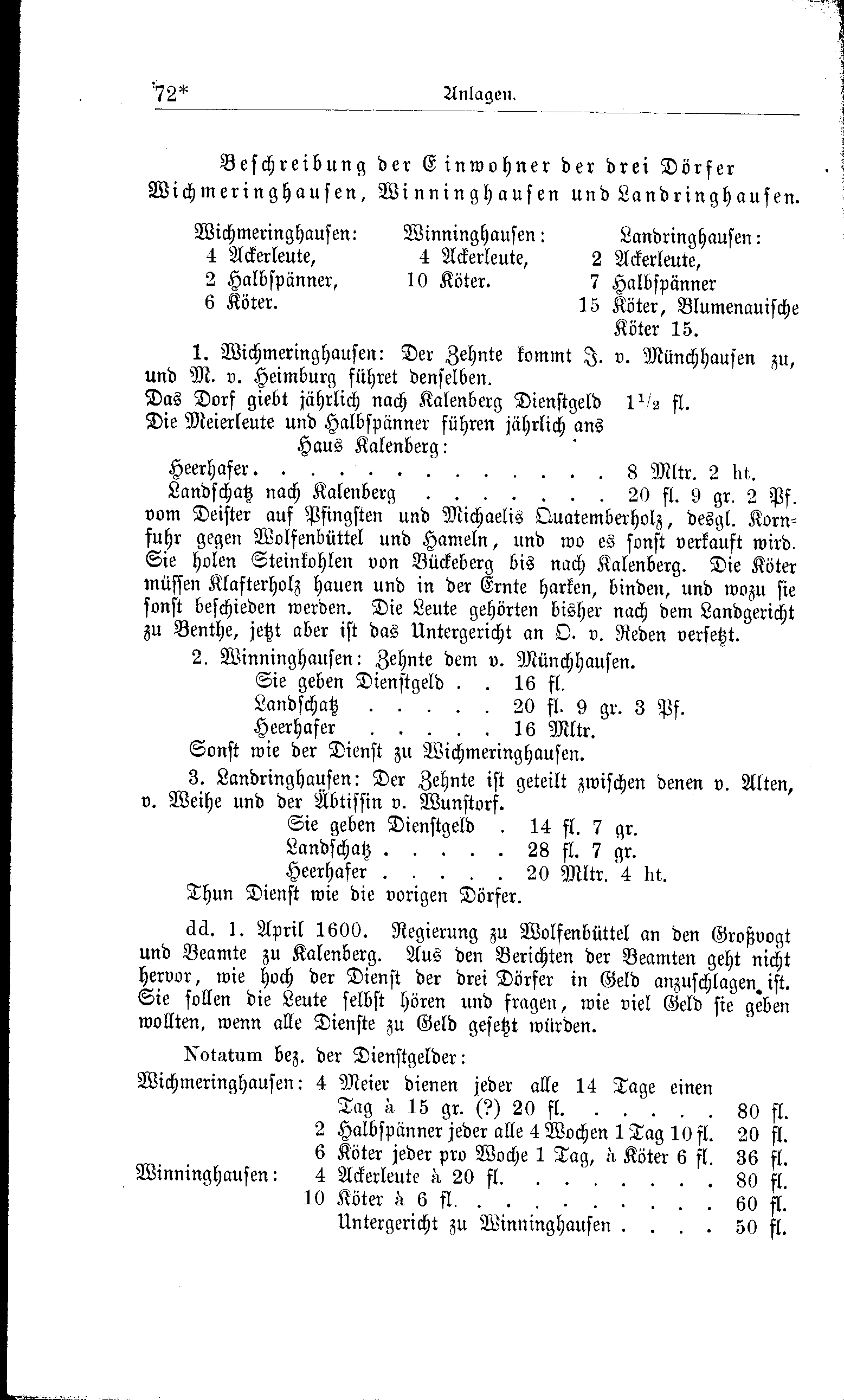 ää. 1. April 1600. Regierung zu Wolfenbüttel an den Großvogt und Beamte zu Kalenberg. Aus den Berichten der Beamten geht nicht hervor, wie hoch der Dienst der drei Dörfer in Geld anzuschlagen, ist. Sie sollen die Leute selbst hören und fragen, wie viel Geld sie geben wollten, wenn alle Dienste zu Geld gesetzt würden.