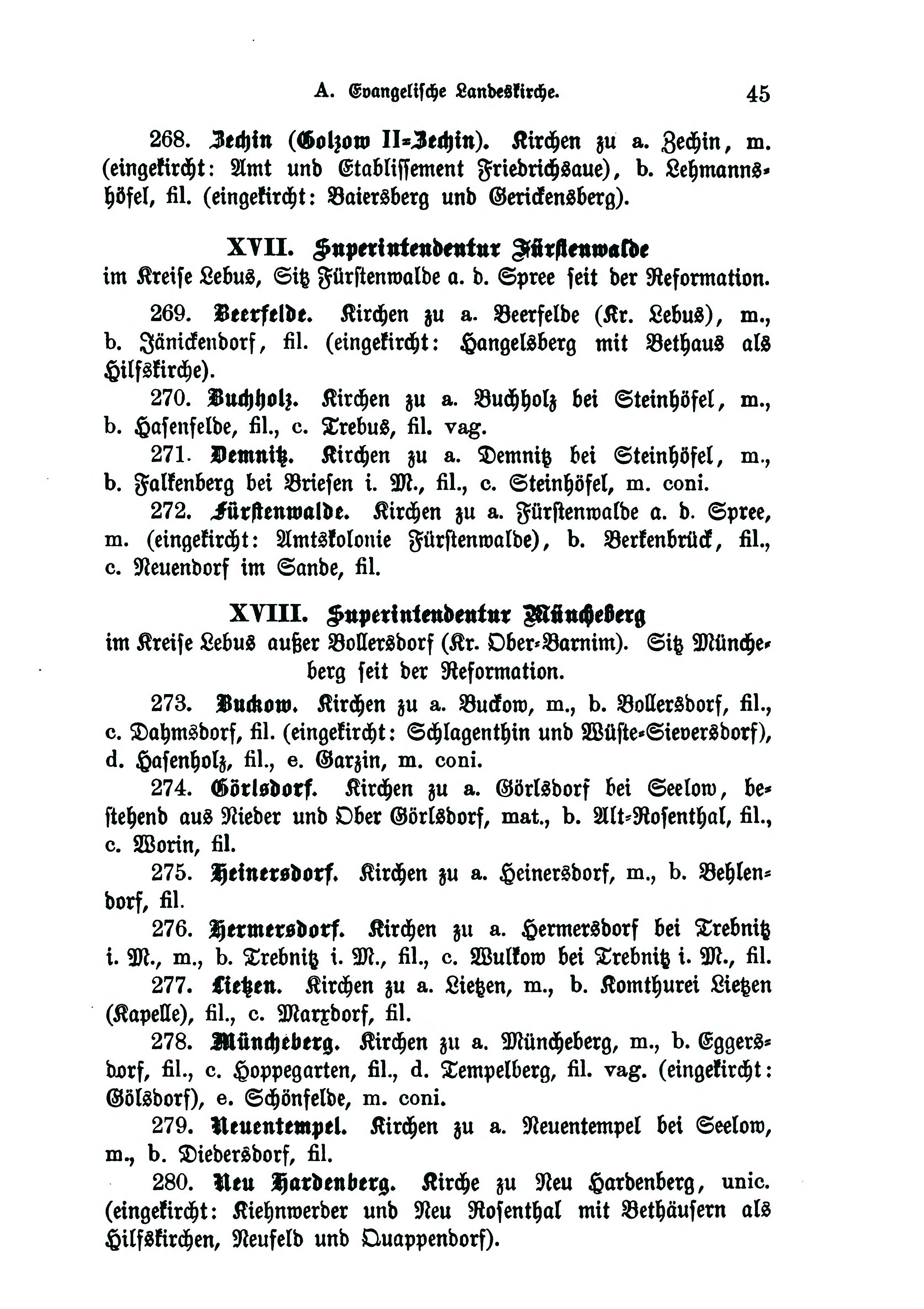 - 272. Fürstenwalde. Kirchen zu a. Fürstenroalde a. d, Spree, m. (eingekircht: Amtskolonie Fürstenwalde), b. Berkenbrück, fil., c. Neuendorf im Sande, fil.