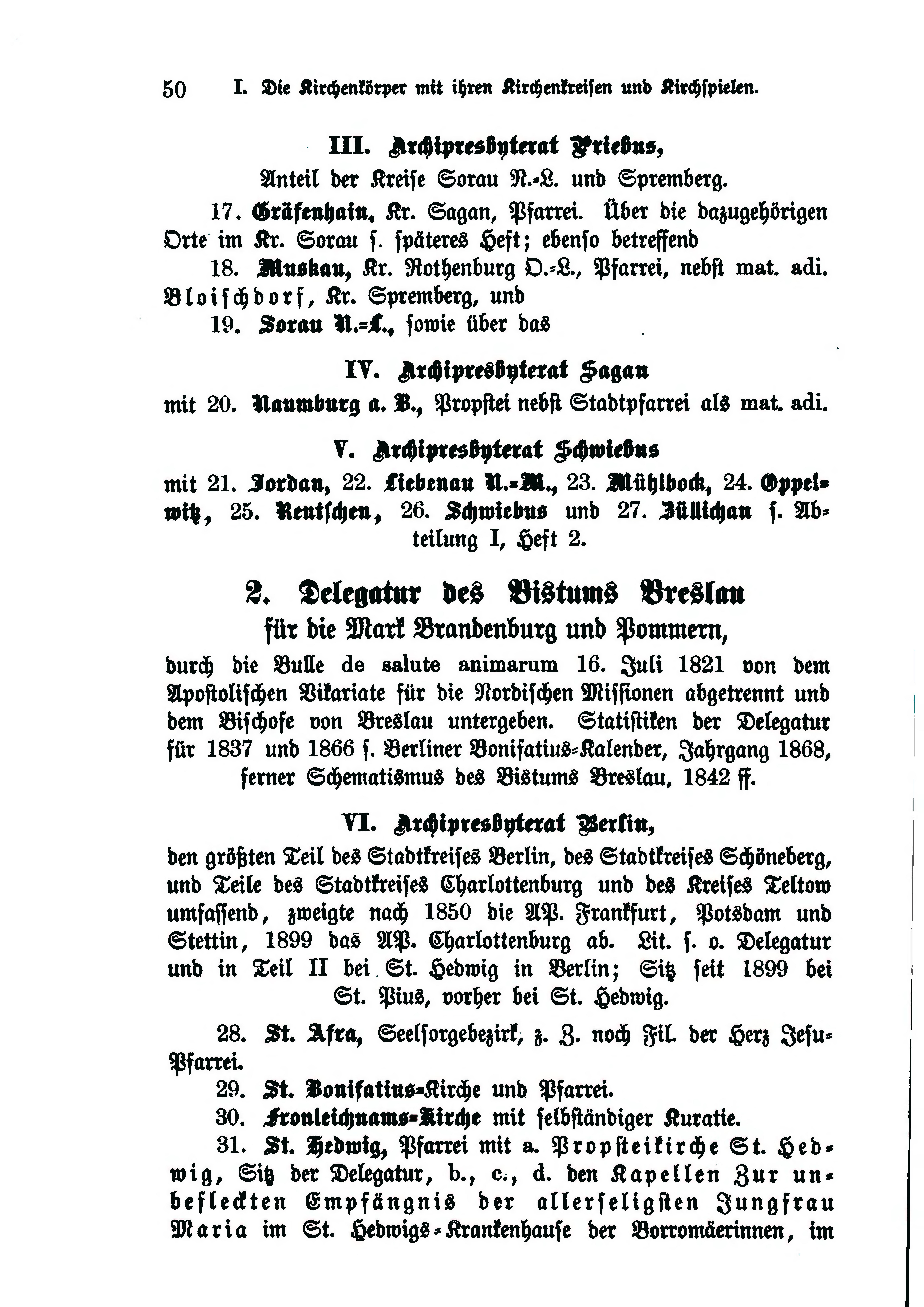 - für die Mark Brandenburg und Pommern, durch die Bulle de saluts animarum 16. Juli 1821 von dem Apostolischen Vikariate für die Nordischen Missionen abgetrennt und dem Bischöfe von Breslau untergeben. Statistiken der Delegatur für 1837 und 1866 s. Berliner Bonifatius-Kalender, Jahrgang 1868, ferner Schematismus des Bistums Breslau, 1842 ff.
