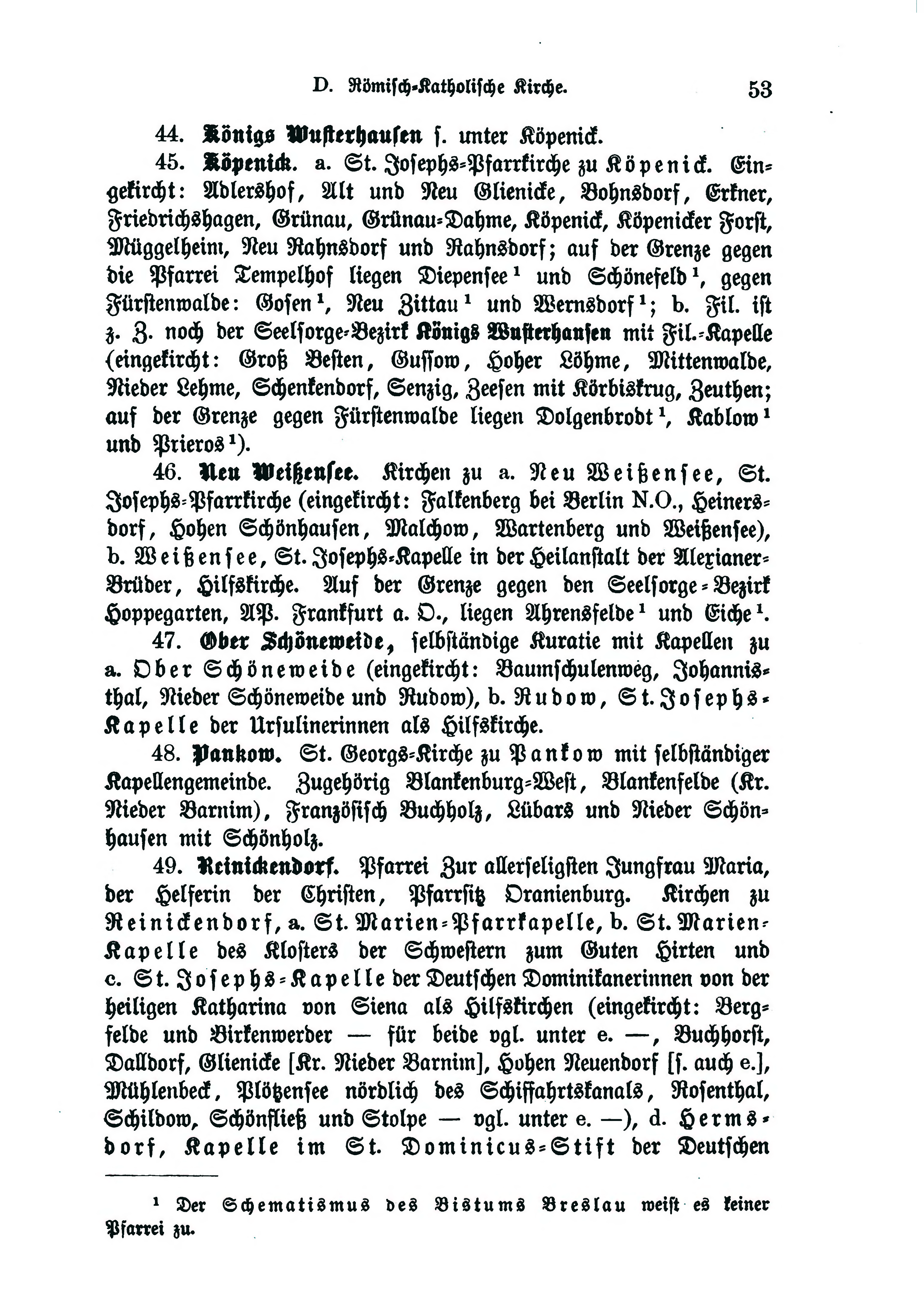 - 45. Köpenick. a. St. Josephs-Pfarrkirche zu Köpenick. Eingekircht: Adlershof, Alt und Neu Glienicke, Bohusdorf, Erkner, Friedrichshagen, Grünau, Grünau-Dahme, Köpenick, Köpenicker Forst, Müggelheim, Neu Rahnsdorf und Rahnsdorf; auf der Grenze gegen die Pfarrei Tempelhof liegen Diepensee [1] und Schönefeld [1] , gegen Fürstenwalde: Gosen [1] Neu Zittau [1] und Wernsdorf [1]; b. ist z. Z. noch der Seelsorge-Bezirk Königs Wusterhausen mit Fil.-Kapelle (eingekircht: Groß Besten, Gussow, Hoher Löhme, Mittenwalde, Nieder Lehme, Schenkendorf, Senzig, Seesen mit Körbiskrug, Zeuthen; auf der Grenze gegen Fürstenwalde liegen Dolgenbrodt [1], Kablow' und Prieros [1].