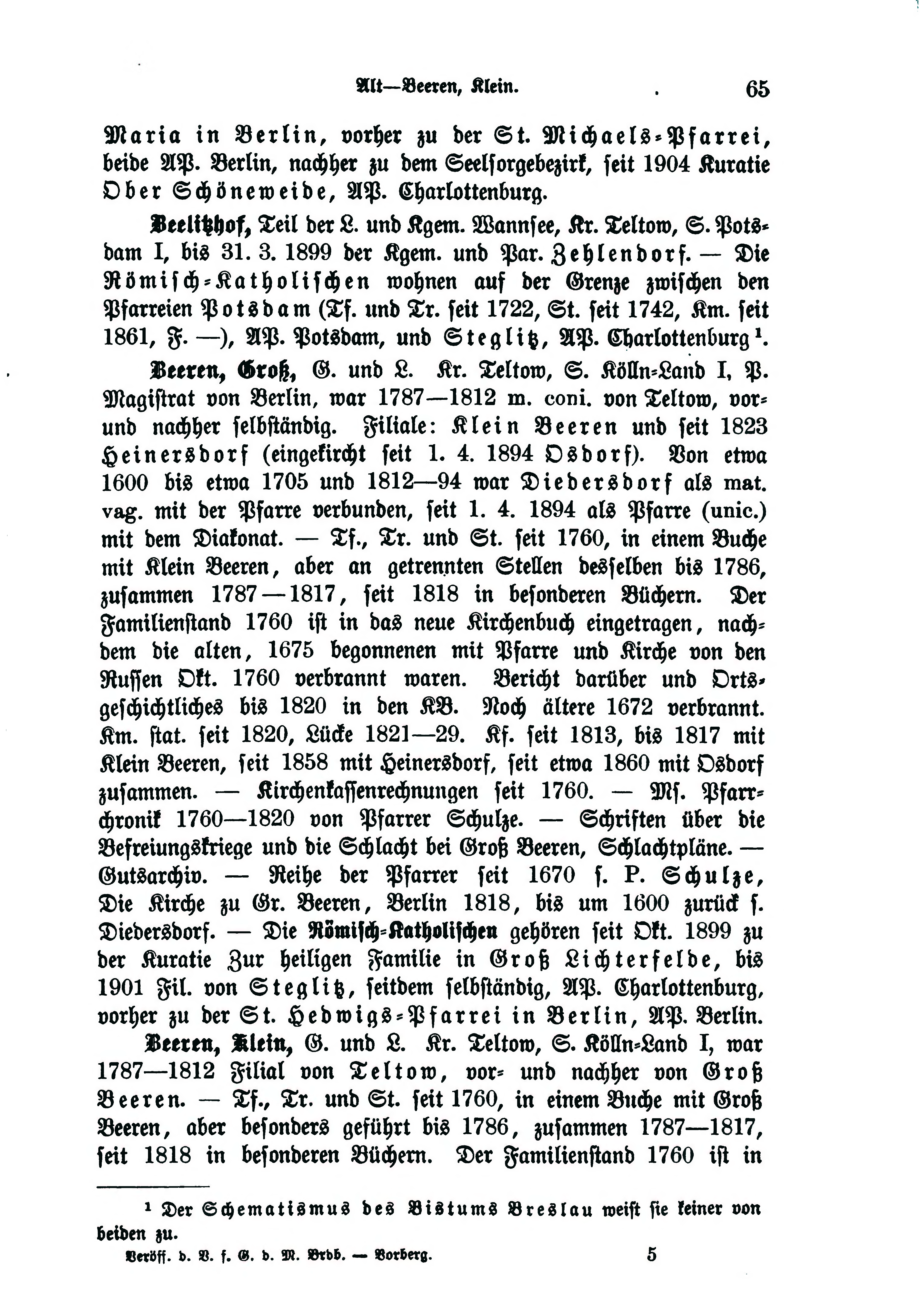 - Beeren, Groß, G. und L. Kr. Teltow, S. Kölln-Land I, P. Magistrat von Berlin, war 1787—1812 m. coni. von Teltow, vor- und nachher selbständig. Filiale: Klein Beeren und seit 1823 Heinersdorf (eingekircht seit 1. 4. 1894 Osdorf). Von etwa 1600 bis etwa 1705 und 1812—94 war Diedersdorf als mat. vag. mit der Pfarre verbunden, seit 1. 4. 1894 als Pfarre (unic.) mit dem Diaconat. — Tr. und St. seit 1760, in einem Buche mit Klein Beeren, aber an getrennten Stellen desselben bis 1786, zusammen 1787 —1817, seit 1818 in besonderen Büchern. Der Familienstand 1760 ist in das neue Kirchenbuch eingetragen, nachdem die alten, 1675 begonnenen mit Pfarre und Kirche von den Russen Okt. 1760 verbrannt waren. Bericht darüber und Ortsgeschichtliches bis 1820 in den KB. Noch ältere 1672 verbrannt. Km. stat. seit 1820, Lücke 1821—29. Kf. seit 1813, bis 1817 mit Klein Beeren, seit 1858 mit Heinersdorf, seit etwa 1860 mit Osdorf zusammen. — Kirchenkassenrechnungen seit 1760. — Ms. Pfarrchronik 1760—1820 von Pfarrer Schulze. — Schriften über die Befreiungskriege und die Schlacht bei Groß Beeren, Schlachtpläne. — Gutsarchiv. — Reihe der Pfarrer seit 1670 s. ?. Schulze, Die Kirche zu Gr. Beeren, Berlin 1818, bis um 1600 zurück s. Diedersdorf. — Die Römisch-Katholischen gehören seit Okt. 1899 zu der Kuratie Zur heiligen Familie in Groß Lichterfelde, bis 1901 von Steglitz, seitdem selbständig, AP. Charlottenburg, vorher zu der St. Hedwigs-Pfarrei in Berlin, AP. Berlin.