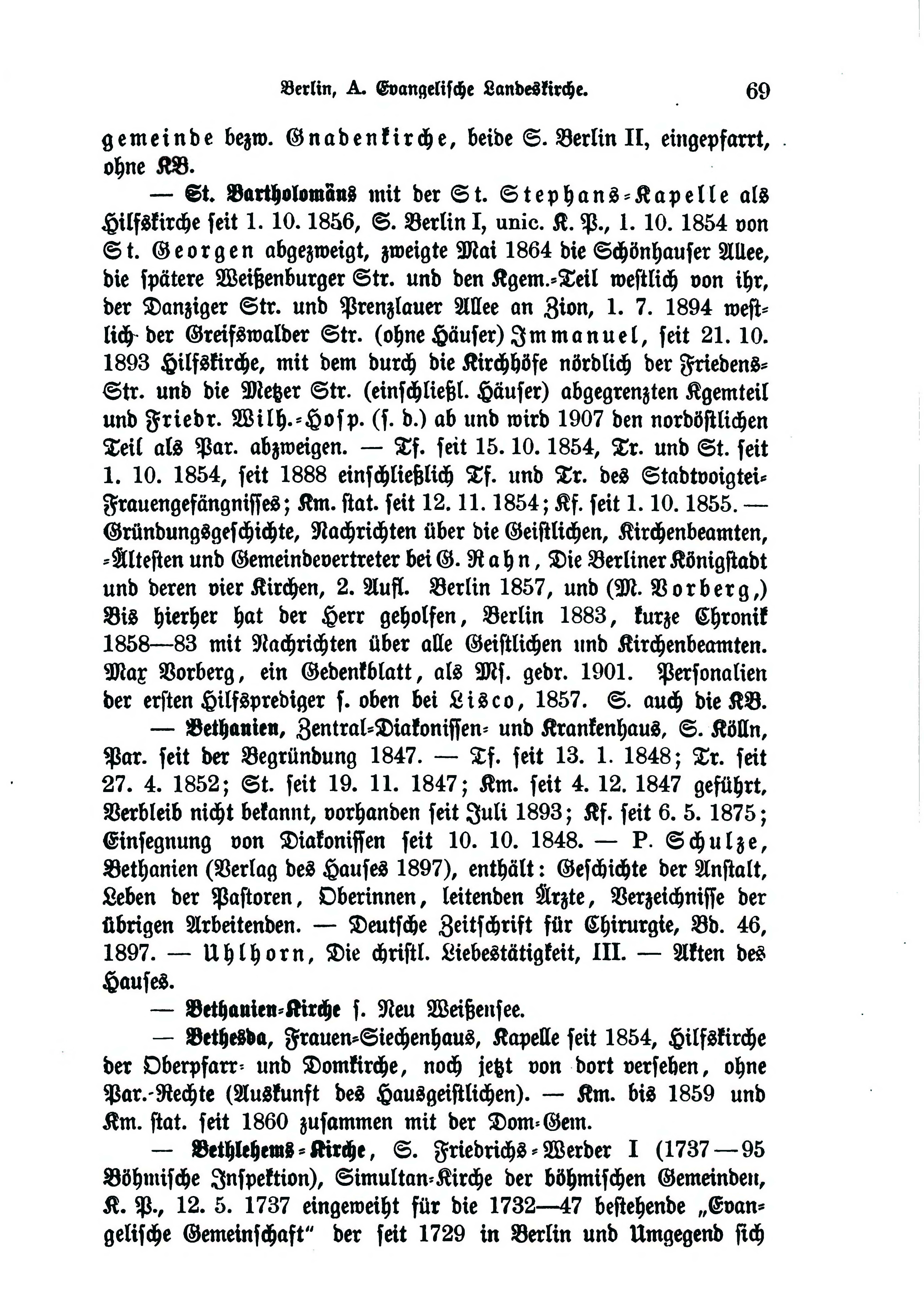 - — St. Bartholomäus mit der St. Stephans-Kapelle als Hilfskirche seit 1. 10.1856, S. Berlin I, unic. K. P., 1. 10. 1854 von St. Georgen abgezweigt, zweigte Mai 1864 die Schönhauser Allee, die spätere Weißenburger Str. und den Kgem.-Teil westlich von ihr, der Danziger Str. und Prenzlauer Allee an Zion, 1. 7. 1894 westlich der Greifswalder Str. (ohne Häuser) Immanuel, seit 21. 10. 1893 Hilfskirche, mit dem durch die Kirchhöfe nördlich der Friedens- Str. und die Metzer Str. (einschließl. Häuser) abgegrenzten Kgemteil und Friedr. Wilh.-Hosp. (s. d.) ab und wird 1907 den nordöstlichen Teil als Par. abzweigen. — Tf. seit 15.10. 1854, Tr. und St. seit 1. 10. 1854, seit 1888 einschließlich Tf. und Tr. des Stadtvoigtei- Frauengefängnisses; Km. stat. seit 12.11.1854; Kf. seit 1.10.1855. — Gründungsgeschichte, Nachrichten über die Geistlichen, Kirchenbeamten, -Ältesten und Gemeindevertreter bei G. Rahn, Die Berliner Königstadt und deren vier Kirchen, 2. Aufl. Berlin 1857, und (M. Vorberg,) Bis hierher hat der Herr geholfen, Berlin 1883, kurze Chronik 1858—83 mit Nachrichten über alle Geistlichen und Kirchenbeamten. Max Vorberg, ein Gedenkblatt, als Mf. gedr. 1901. Personalien der ersten Hilfsprediger s. oben bei Lisco, 1857. S. auch die KB.