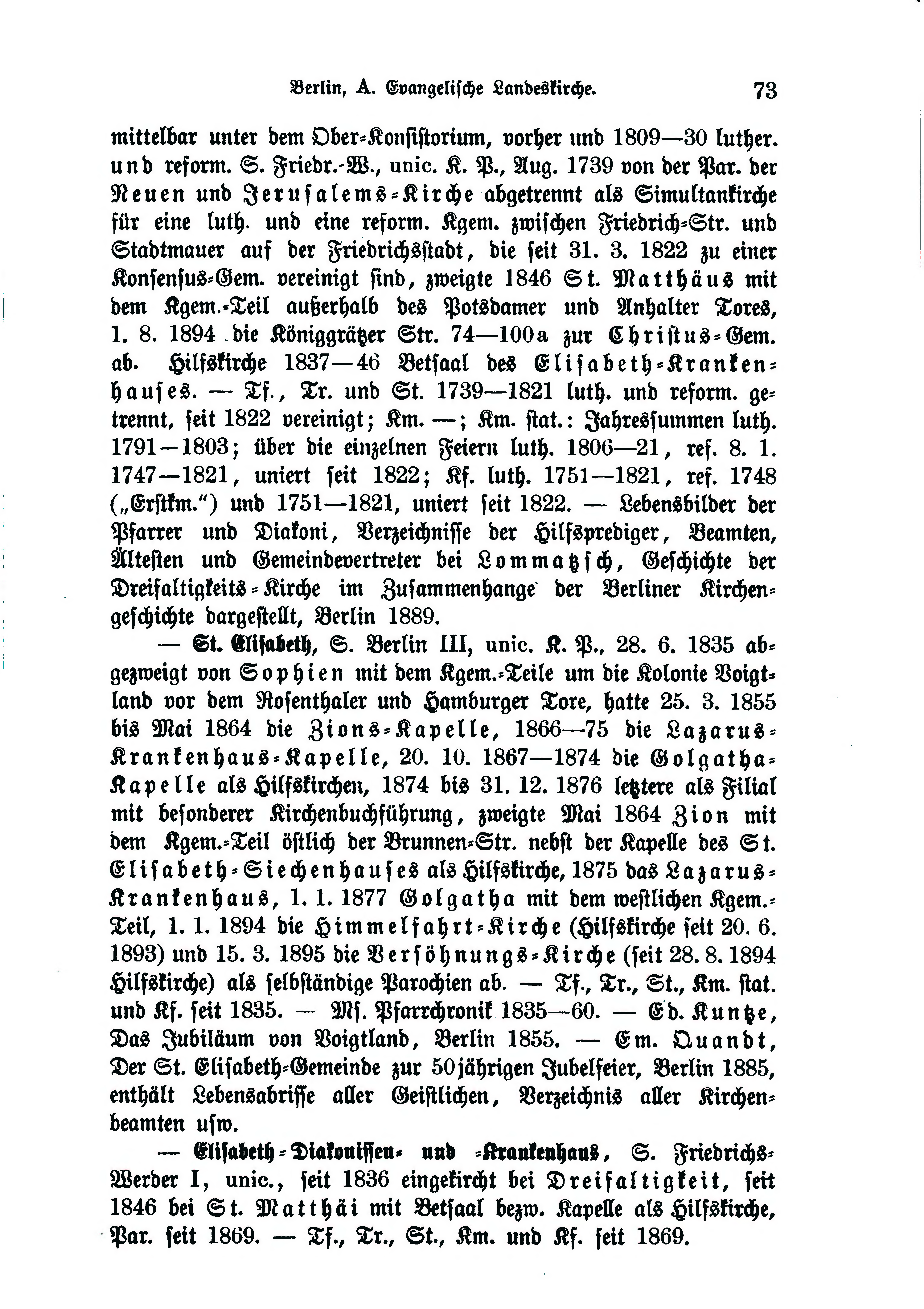 mittelbar unter dem Ober-Konsistorium, vorher und 1809—30 luther. und reform. S. Friedr. W., unic. K. P., Aug. 1739 von der Par. der Neuen und Jerusalems-Kirche abgetrennt als Simultankirche für eine luth. und eine reform. Kgem. zwischen Friedrich-Str. und Stadtmauer aus der Friedrichsstadt, die seit 31. 3. 1822 zu einer Konsensus-Gem. vereinigt sind, zweigte 1846 St. Matthäus mit dem Kgem.-Teil außerhalb des Potsdamer und Anhalter Tores, 1. 8. 1894 die Königgrätzer Str. 74 —100a zur Christus-Gem. ab- Hilfskirche 1837—46 Betsaal des Elisabeth-Krankenhauses. — Tr. und St. 1739—1821 luth. und reform, getrennt, seit 1822 vereinigt; Km. —; Km. stat.: Jahressummen luth. 1791-1893; über die einzelnen Feiern luth. 1806—21, ref. 8. 1. 1747—1821, uniert seit 1822; Kf. luth. 1751—1821, ref. 1748 („Erstkm.") und 1751—1821, uniert seit 1822. — Lebensbilder der Pfarrer und Diakoni, Verzeichnisse der Hilfsprediger, Beamten, Ältesten und Gemeindevertreter bei Lommatzsch, Geschichte der Dreisaltigkeits - Kirche im Zusammenhange der Berliner Kirchengeschichte dargestellt, Berlin 1889.