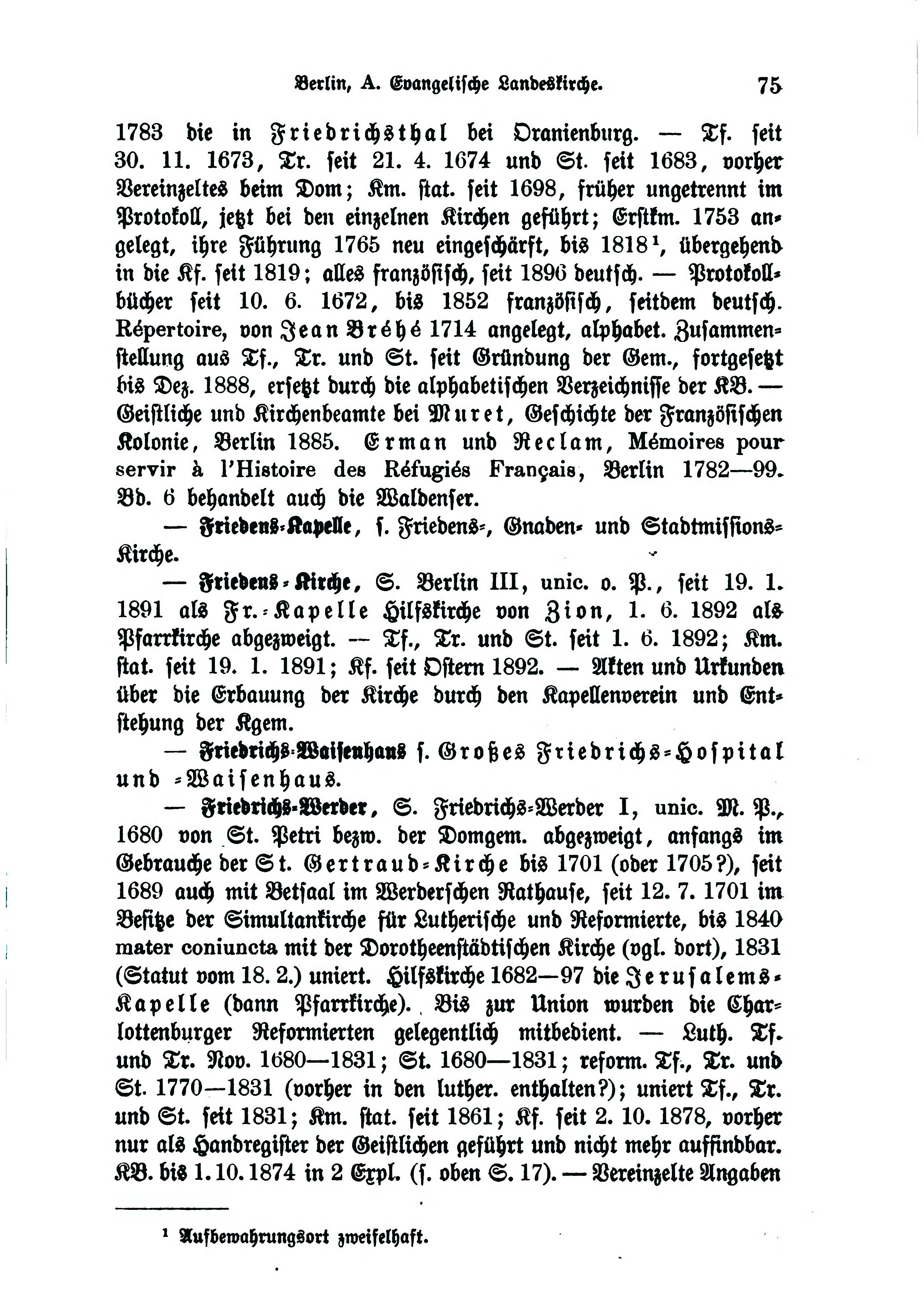 1783 die in Friedrichsthal bei Oranienburg. — Tf. seit 30. 11. 1673, Tr. seit 21. 4. 1674 und St, seit 1683, vorher Vereinzeltes beim Dom; Km. stat. seit 1698, früher ungetrennt im Protokoll, jetzt bei den einzelnen Kirchen geführt; Erstkm. 1753 angelegt, ihre Führung 1765 neu eingeschärft, bis 1818 [1] , übergehend in die Kf. seit 1819; alles französisch, seit 1896 deutsch. — Protokollbücher seit 10. 6. 1672, bis 1852 französisch, seitdem deutsch. Répertoire, von Jean Bréhé 1714 angelegt, alphabet. Zusammenstellung aus Tr. und St. seit Gründung der Gem., fortgesetzt bis Dez. 1888, erseht durch die alphabetischen Verzeichnisse der KB. — Geistliche und Kirchenbeamte bei Muret, Geschichte der Französischen Kolonie, Berlin 1885. Erman und Reclam, Memoires pour servir á I'Histoire ds Réfugiés Français, Berlin 1782—99. Bd. 6 behandelt auch die Waldenser.
